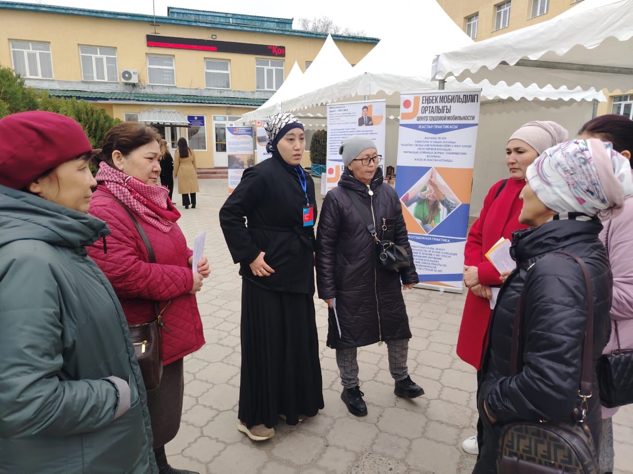 Жәрмеңке «Қонаев қаласының көпсалалы колледжі» МКҚК ғимараты аумағында өтті, жұмыс іздеушілер бос жұмыс орындарымен таныстырылып, түсіндірме жұмыстары жүргізілді.