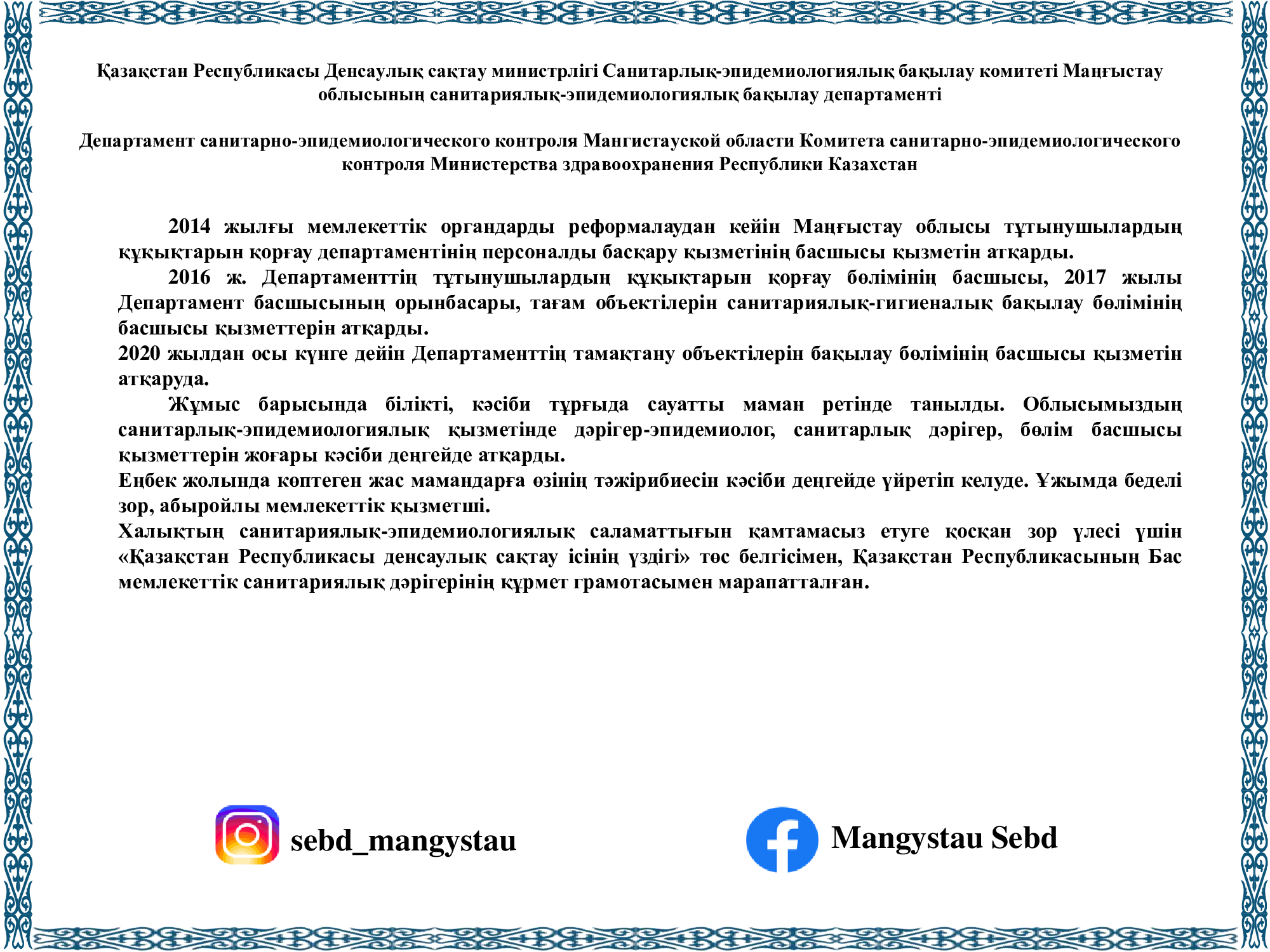 2020 жылдан осы күнге дейін Департаменттің тамақтану объектілерін бақылау бөлімінің басшысы қызметін атқаруда.