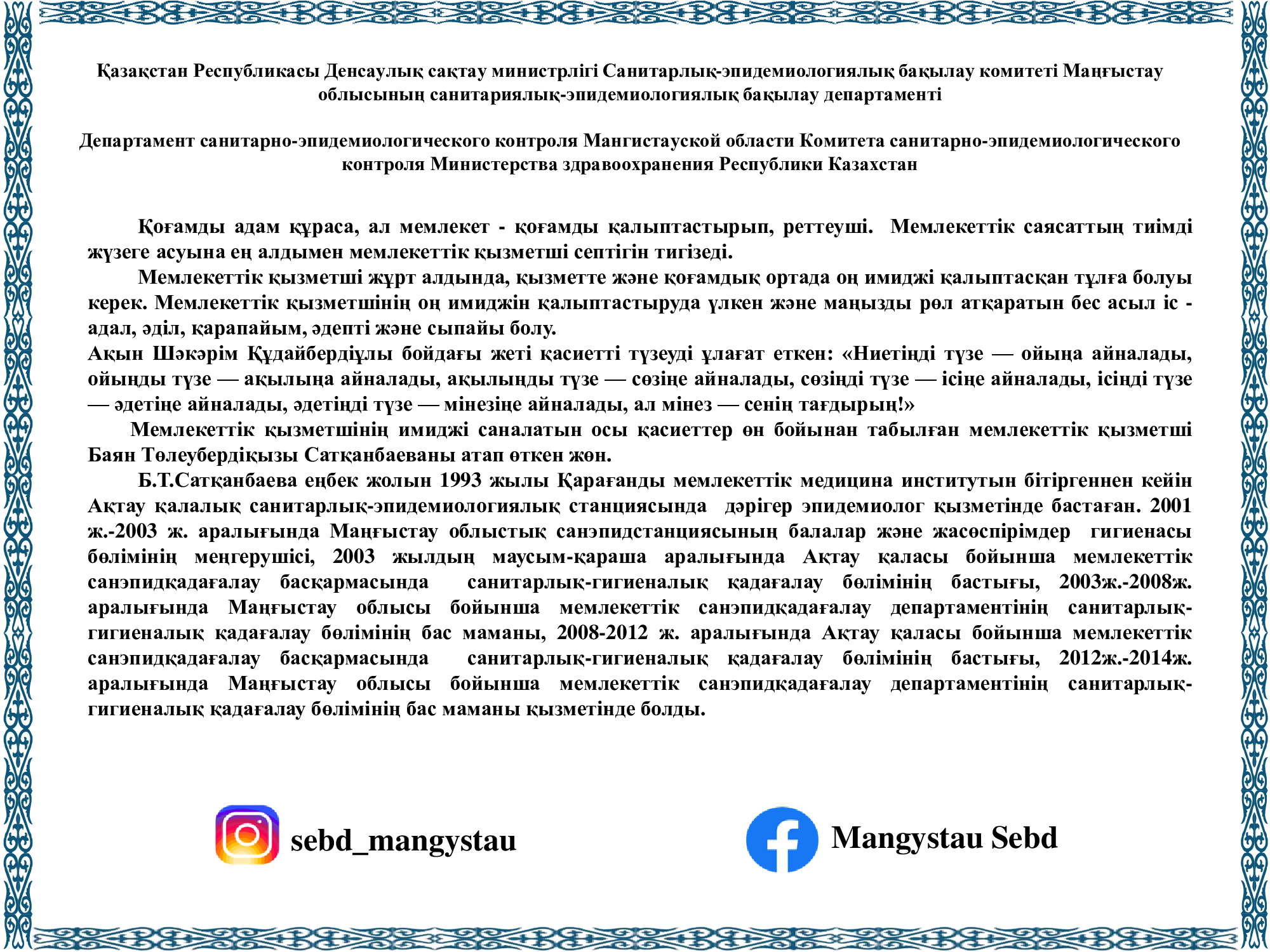Мемлекеттік қызметшінің имиджі саналатын осы қасиеттер өн бойынан табылған мемлекеттік қызметші Баян Төлеубердіқызы Сатқанбаеваны атап өткен жөн.