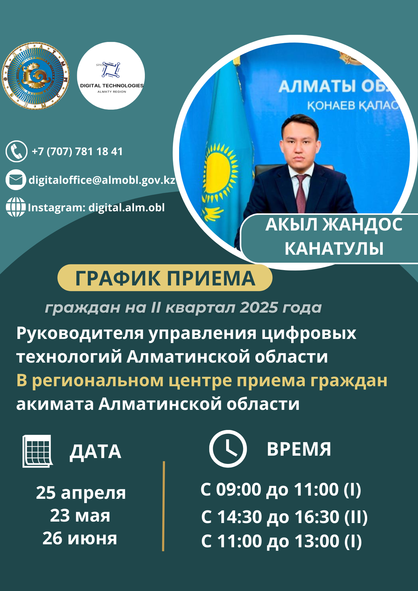 Алматы облысы әкімдігінің «Өңірлік азаматтарды қабылдау» орталығында Алматы облысының цифрлық технологиялар басқармасының басшысы Ақыл Жандос Қанатұлының 2025 жылғы ІI тоқсанға арналған азаматтарды қабылдау кестесі 🗓️