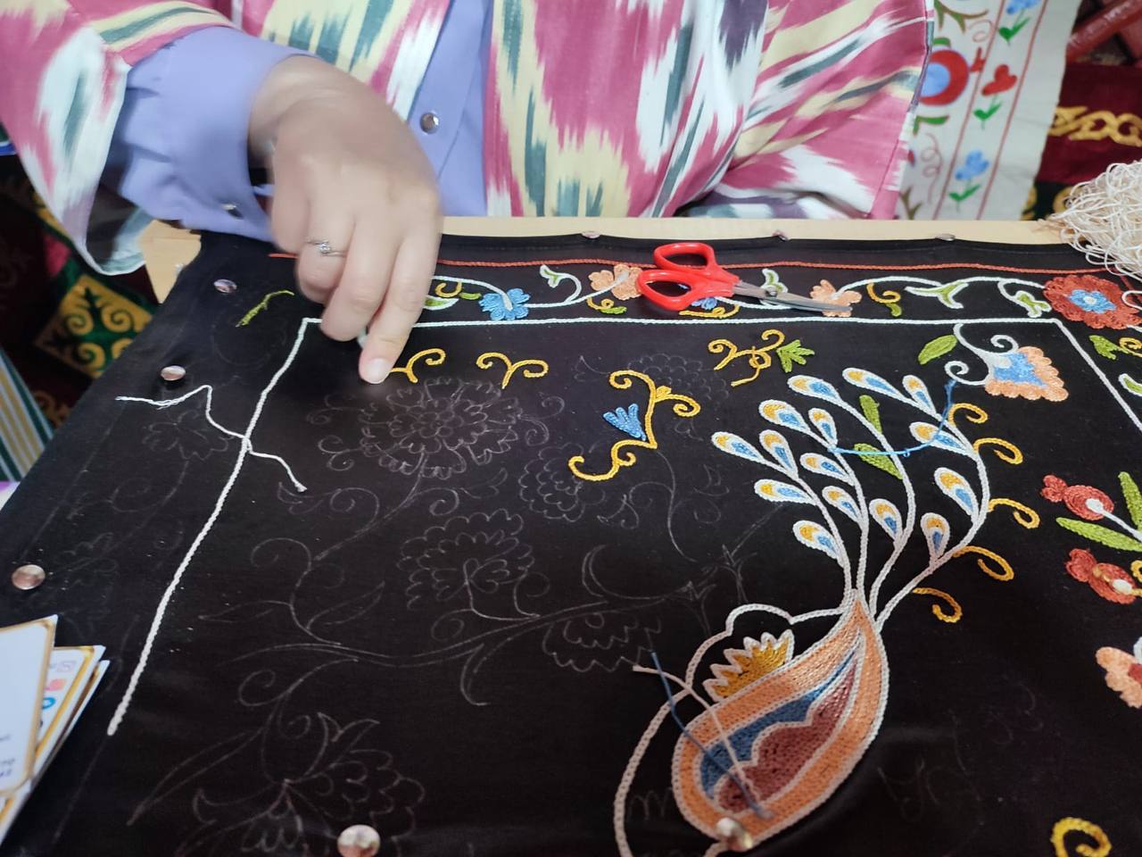 Жібектен кесте тігу шебері – Насиба Исхакова мен оның суретші күйеуі Санжар Исхаков та іс-шарада бой көрсетті. Олар 24 жылдан бері осы іспен айналысып келеді. Шеберлер жібек матаны жібек жіппен кестелейді, сурет салады және сюжеттер ойлап табады. Бұл өнер «сюзане» деп аталады. Қолөнерші төсек-орын, шапан тігеді.