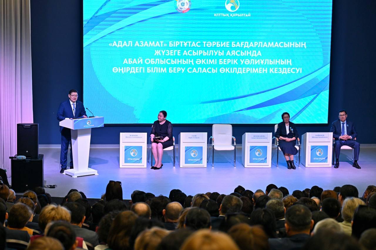 Семейдегі Мұхтар Әуезов атындағы педагогикалық колледжде «Адал азамат» біртұтас тәрбие бағдарламасының жүзеге асырылуы аясында облыс әкімі Берік Уәлимен MEETUP-кездесу өтті. Шараға облыстық мәслихат төрағасы, ардагер ұстаздар, жоғары оқу орындарының басшылары, мектепке дейінгі, орта, техникалық және кәсіптік білім беру ұйымдарының өкілдері мен студенттер қатысты.