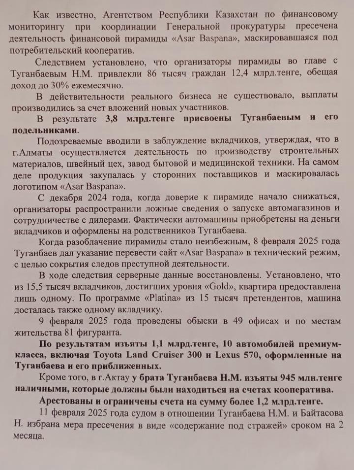 «Asar Baspana» қаржы пирамидаларының қызметі туралы