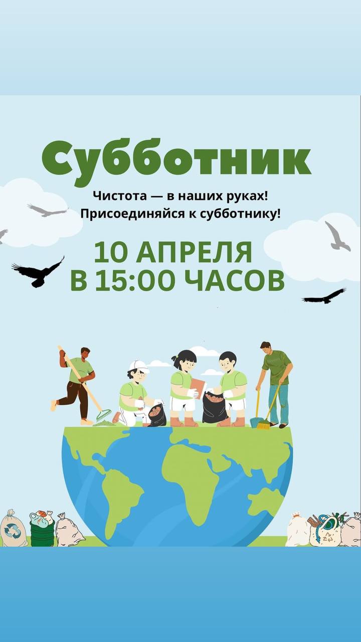 Баршаңызды сенбілікке қатысуға шақырамыз! Күні мен уақыты: 10 сәуір, сағат 15:00. Қала тазалығына бірге үлес қосайық! Әрбір адамның қатысуы маңызды!