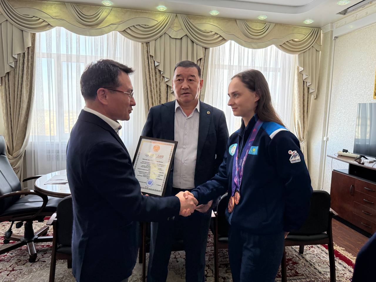 Бүгін Степногорск қаласында 2025 жылы Италияның Турин қаласында өткен қысқы Универсиадада қола жүлдеге ие болған биатлоншы Арина Александровна Крюковаға қала әкімінің атынан алғыс хат табысталды.
