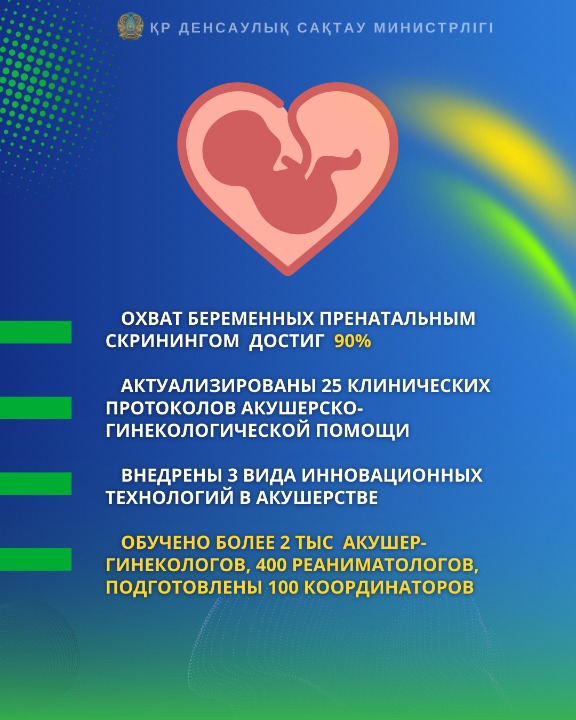 Денсаулық сақтау министрлігі жүкті әйелдердің жағдайын бақылау мен диагностикалауды жақсарту үшін тиімді шаралар қабылдауда, жаңа скринингтік бағдарламалар енгізілуде, болашақ аналардың репродуктивтік функцияларын сақтауға мүмкіндік беретін акушерлікте инновациялық емдеу әдістері сәтті қолданылуда.