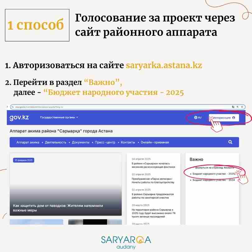Өз аулаңызды абаттандыруды қолдағыңыз келе ме немесе басқа бір ұнаған жобаны дауыс бергіңіз келсе төмендегі нұсқаулықты қолдансаңыз болады. «Сарыарқа» ауданы әкімі аппаратының ресми сайтына saryarka.astana.kz кіріп, тіркелу қажет.
