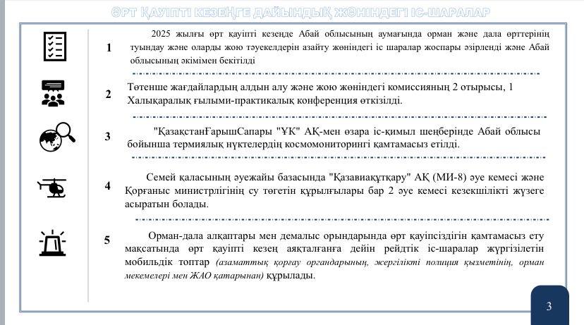 Төтенше жағдайлар департаментінің бастығы Манарбек Шапағатовтың айтуынша, соңғы жылдары облыста орман өрті азайған. Аймақта өрт қаупін азайту мақсатында өңірлік іс-шаралар жоспары бекітілген. Соған сәйкес Семей қаласы әуежайы базасындағы «Қазавиақұтқару» және Қорғаныс министрлігіне қарасты үш тікұшақ кезекшілікке қойылған.
