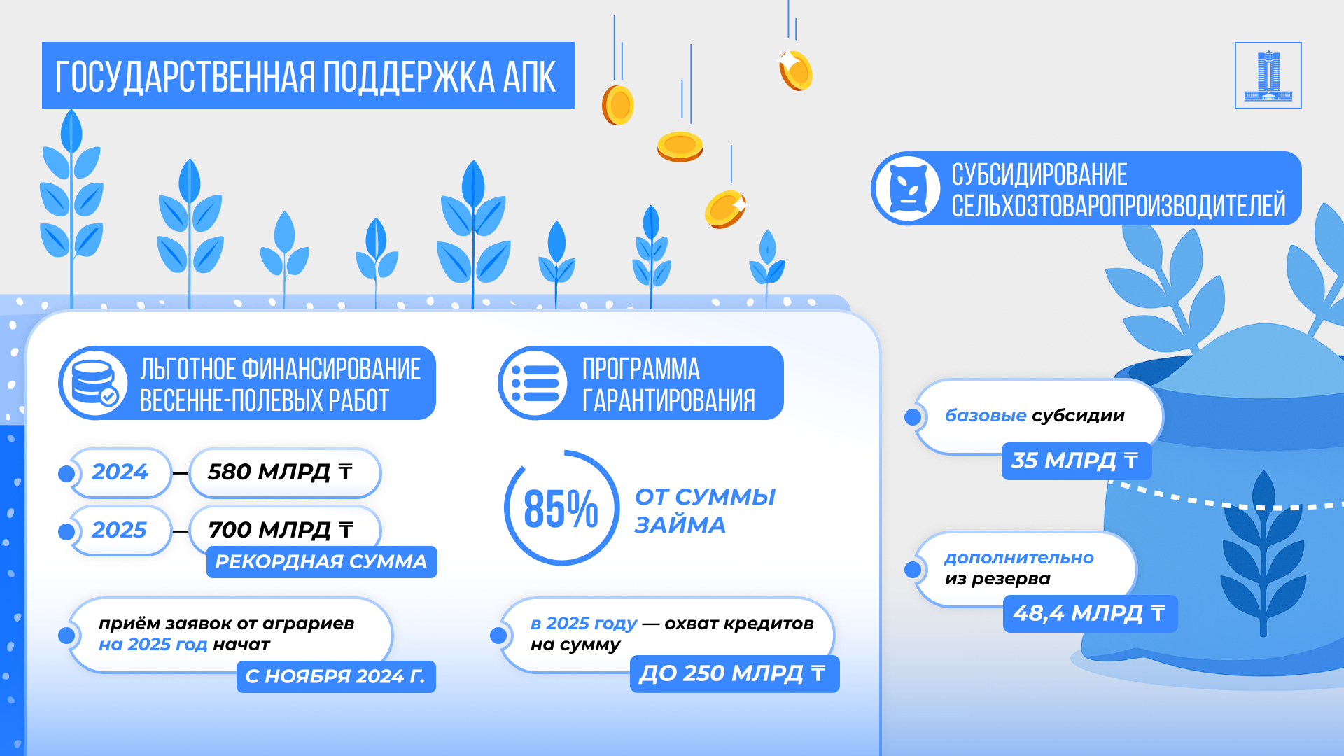 - егіс науқанын жеңілдікпен қаржыландыру көлемі өткен жылы 580 млрд теңгеге дейін және несиелеуді мерзімінен бұрын іске қосу арқылы биыл рекордтық 700 млрд теңгеге дейін артты (бұрын қаржыландыру 140 млрд теңгеден аспаған). Алғаш рет көктемгі дала жұмыстарында қарыз сомасының 85%-на дейін кепілдендірудің арнайы бағдарламасы енгізілді;