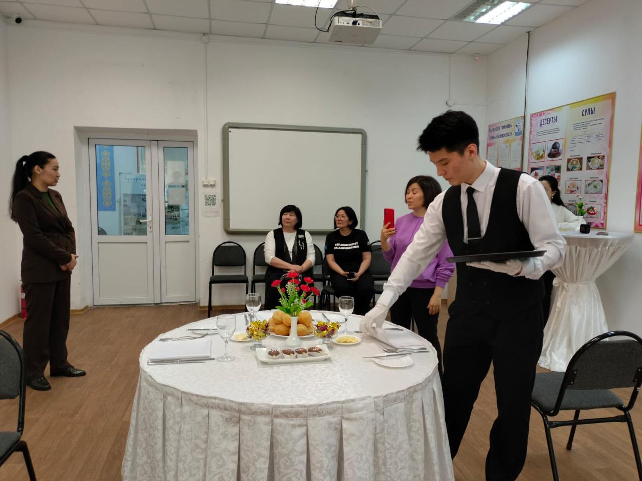 – “Мейрамхана сервисі”, студенттер түскі асқа 3 адамға арналған үстелді ұсынуда, “Креп Сюзетт” жалынында және зығыр майлықтарды 17 позицияға бүктеуде шеберлік сағатын көрсетті.