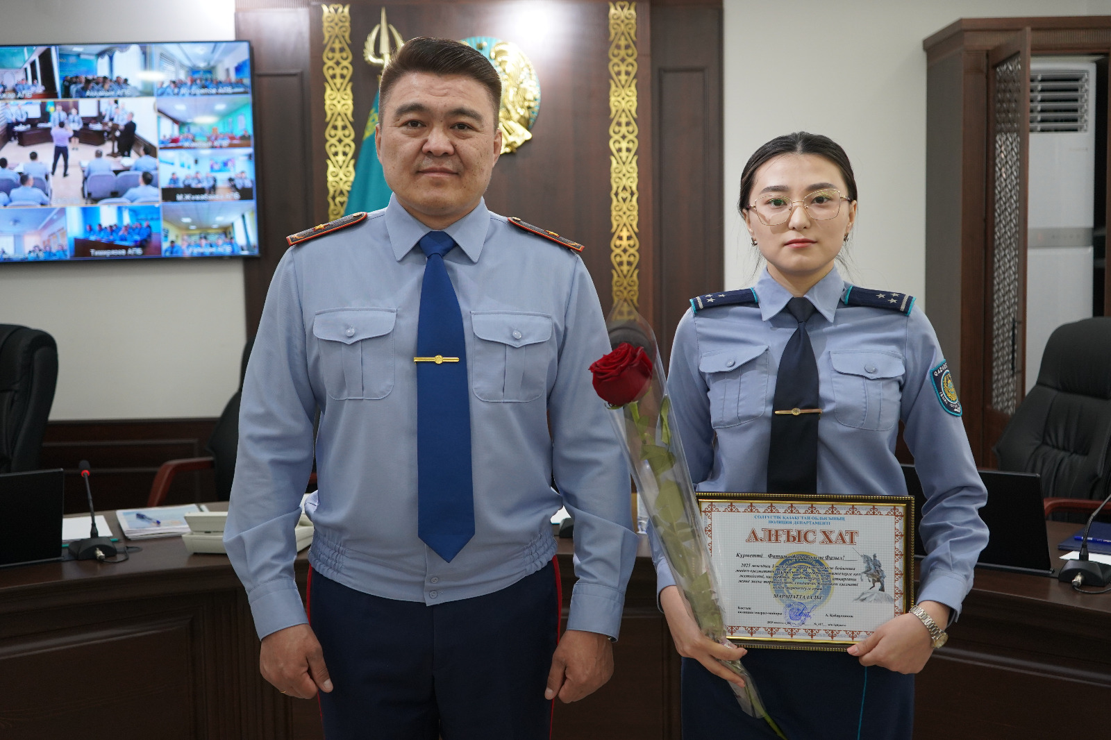 Ішкі істер министрінің бұйрығына сәйкес, жұмыста жоғары көрсеткіштерге қол жеткізгені үшін Петропавл қаласы полиция басқармасы тергеу бөлімінің аға тергеушісі Алена Дёроваға атқарып отырған лауазымынан бір сатыға жоғары полиция подполковнигі атағы берілді.