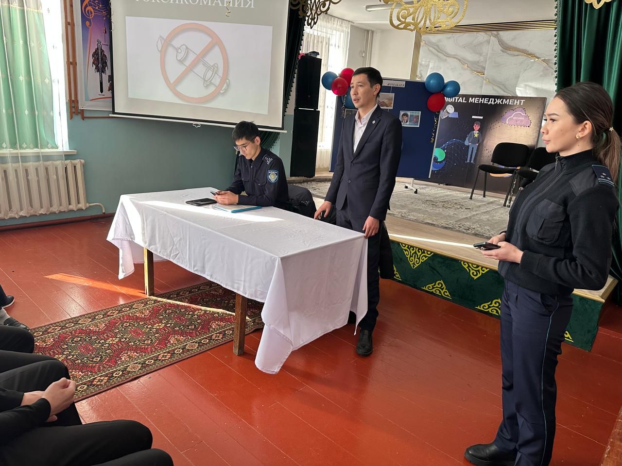 Кәмелетке толмағандар тарапынан жасалатын құқық бұзушылықтың алдын алу мақсатында округ оқушыларымен кездесу өткізді. Жасөспірімдер арасындағы құқық бұзушылық пен қылмыстың алдын-алу, топтық төбелесті болдырмау, интернет қауіпсіздігі мен кибербуллинг, лудомания, нашақорлық, зорлық-зомбылықтың алдын алу мақсатында профилактикалық түсіндірме жұмыстарын жүргізді.Кездесу барысында тақырыптар кеңінен талқыланып, оқушылар зор ықыласпен тыңдап, барлық қызықтырған сұрақтарына жауаптар алды.