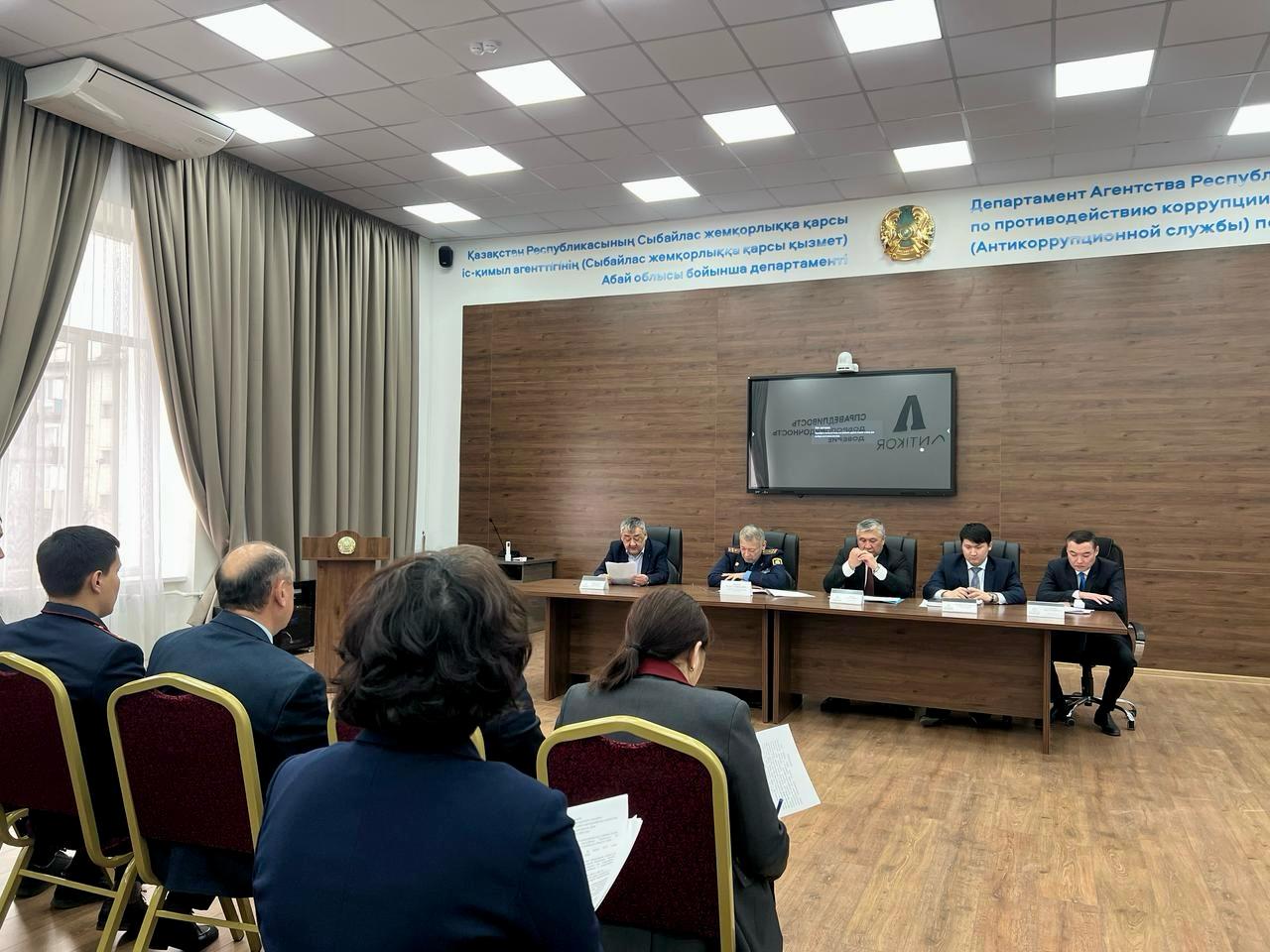 Абай облысында Қазақстан Республикасы Сыбайлас жемқорлыққа қарсы іс-қимыл агенттігінің (Сыбайлас жемқорлыққа қарсы қызмет) Абай облысы бойынша департаментінің және Абай облысының Кәсіпкерлер палатасының Кәсіпкерлердің құқықтарын қорғау және сыбайлас жемқорлыққа қарсы іс-қимыл жөніндегі кеңестің бірлескен отырысы болды.