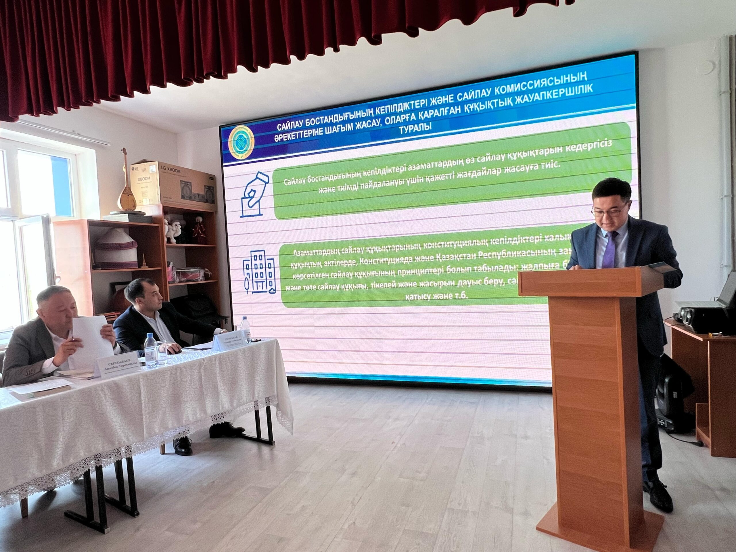 Әрі қарай, Қордай аудандық сайлау комиссиясының мүшесі Е.Токтогулов «Сайлау бостандығының кепілдіктері және сайлау комиссиясының әрекеттеріне шағым жасау, оларға қаралған құқықтық жауапкершілік туралы» және «Төтенше жағдай және арыз-шағымды қарау алгоритмі туралы» тақырыбында түсініктеме берді.