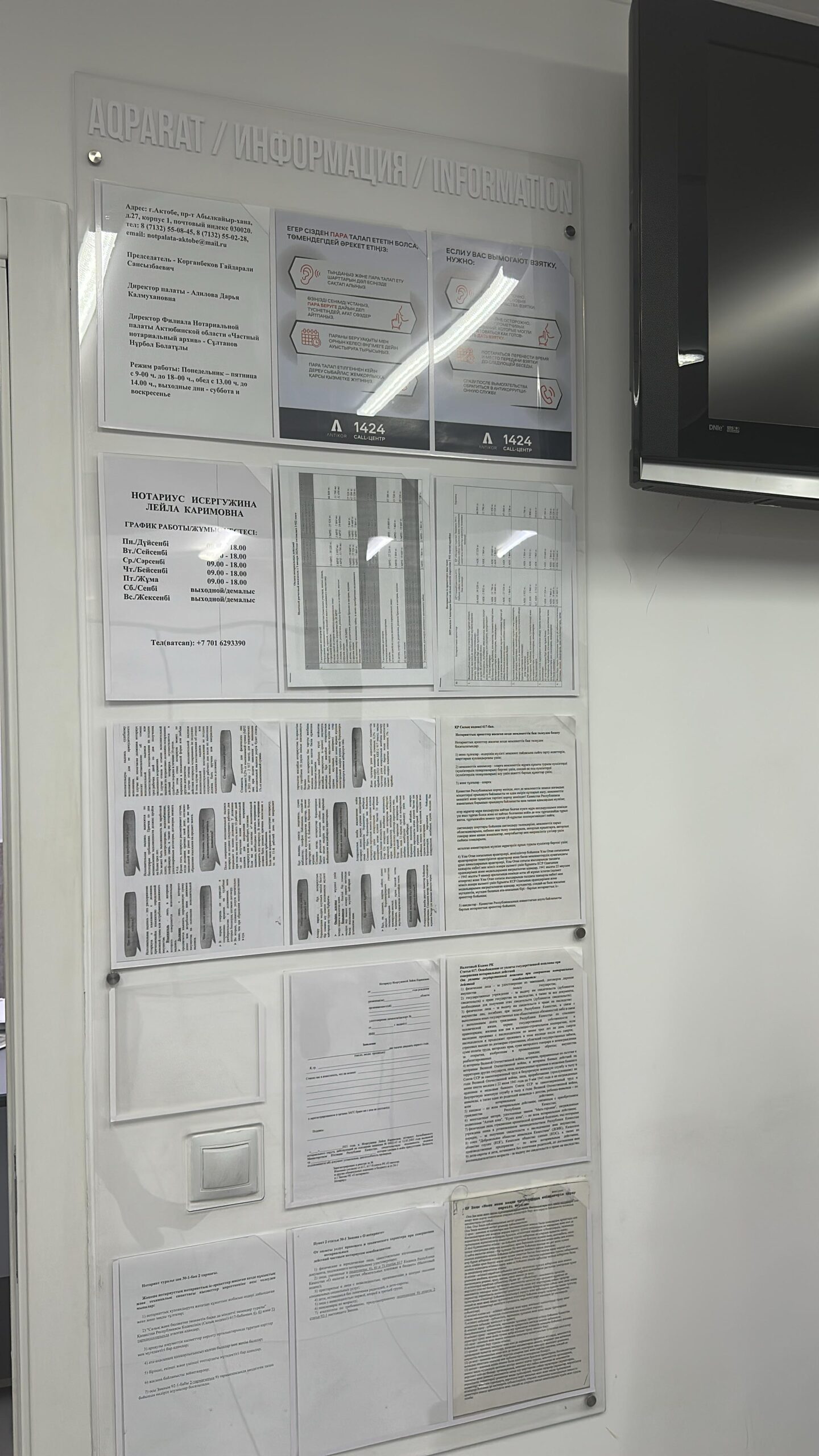 Барлық нотариустарда азаматтар сыбайлас жемқорлық фактілері туралы сұрақтармен немесе хабарламалармен жүгіне алатын 1424 бірыңғай колл-орталығының жұмысы туралы ақпараты бар плакаттар орналастырылған.