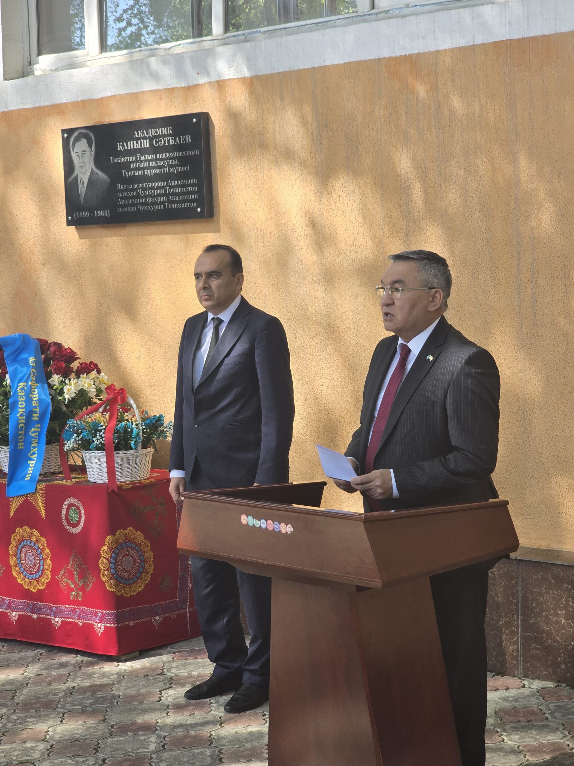 Душанбе, 2025 жылғы 11 сәуір – Геология, сейсмологиялық құрылыс және сейсмология институтында тәжік академиялық ғылымының қызметін ұйымдастыруға үлкен үлес қосқан, сонымен қатар бүкіл Орталық Азия аймағында геологиялық зерттеулермен танымал, Тәжікстан Ғылым Академиясының тұңғыш құрметті академигі, көрнекті қазақстандық ғалым Қаныш Имантайұлы Сәтпаевтың естелік мемориалдық тақтасының жанына гүл шоқтарын қою рәсімі өтті.