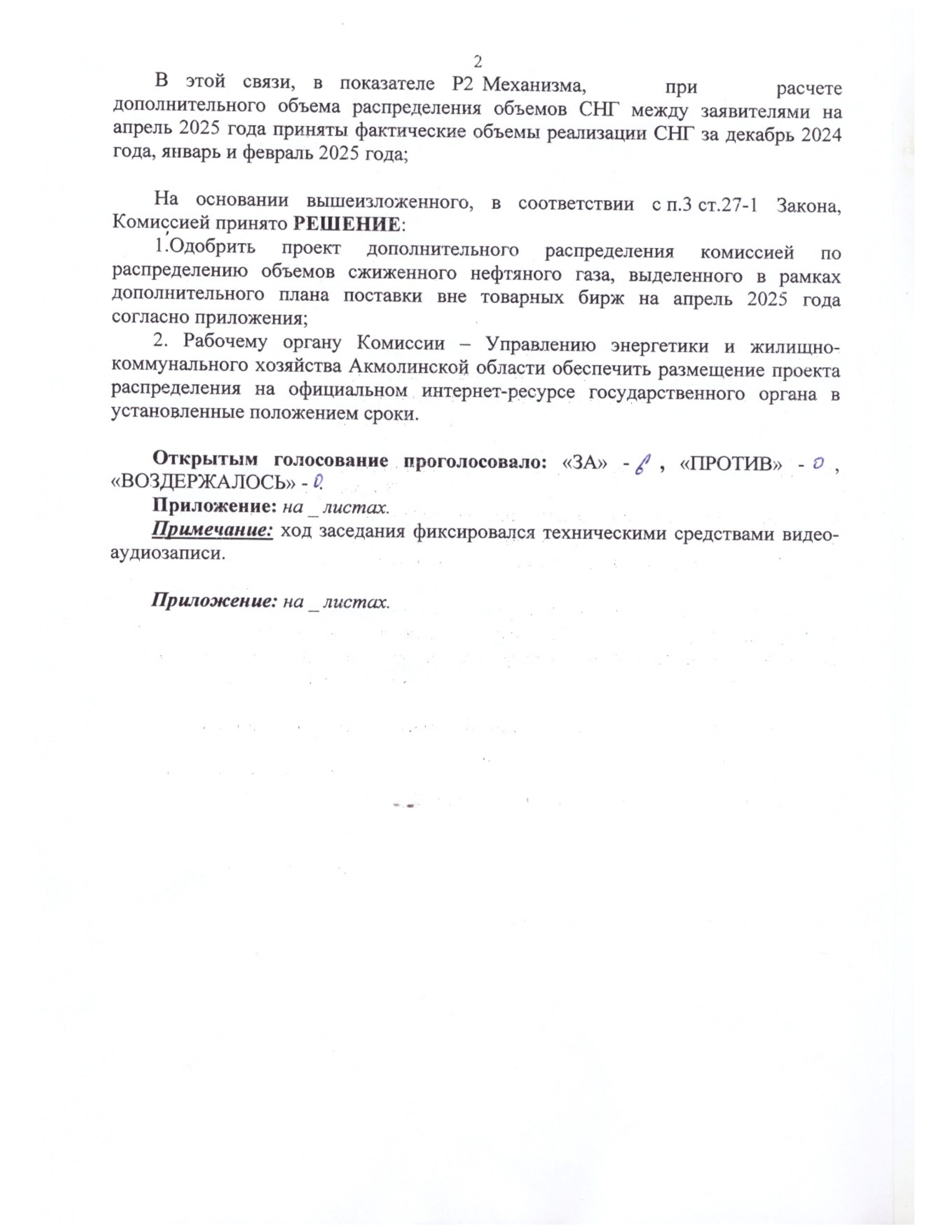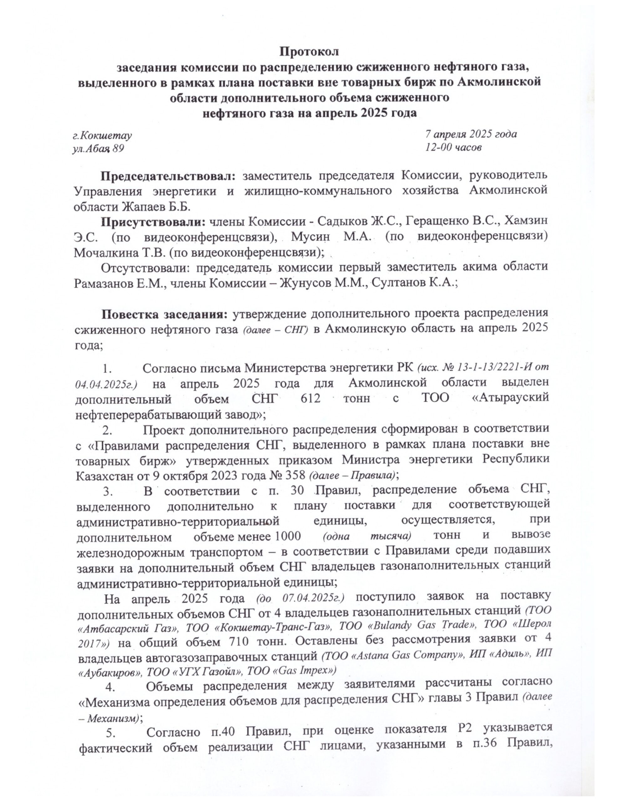 Ақмола облысы бойынша биржалар 2025 жылғы сәуірға арналған сұйытылған мұнай газының қосымша көлемі. Бекітілген тарату жобасы өндіруші зауыттарға және Қазақстан Республикасының Энергетика министрлігіне жіберілді. Отырыс хаттамасының көшірмелері, бөлу жобалары, көлемдерді анықтау тетіктері қоса беріледі.