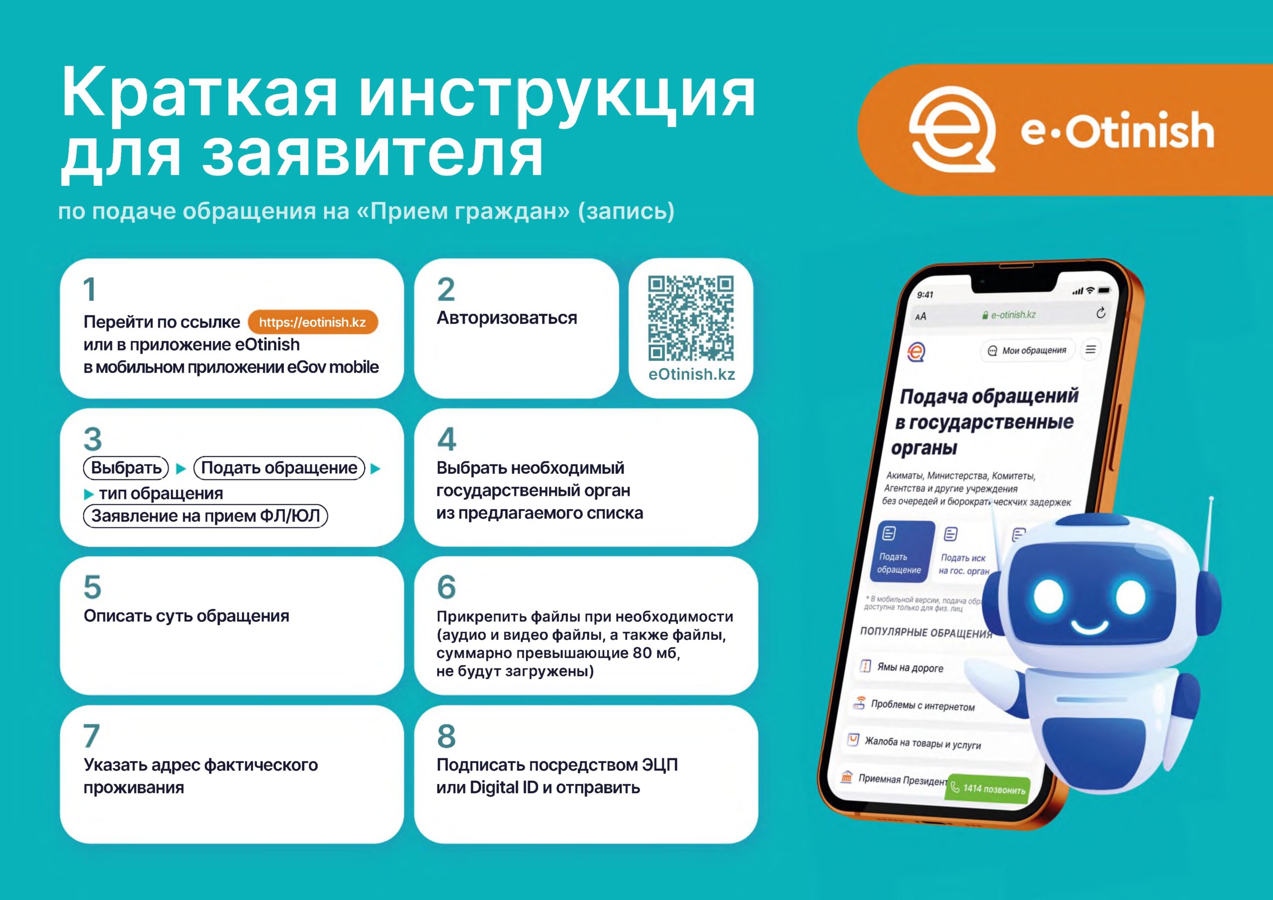 Азаматтар мен заңды тұлғалардың өкілдерін қабылдау кестесі Департаменттің веб-ресурсында жарияланды, сондай-ақ мемлекеттік органдардың ақпараттық стендтерінде орналастырылды.