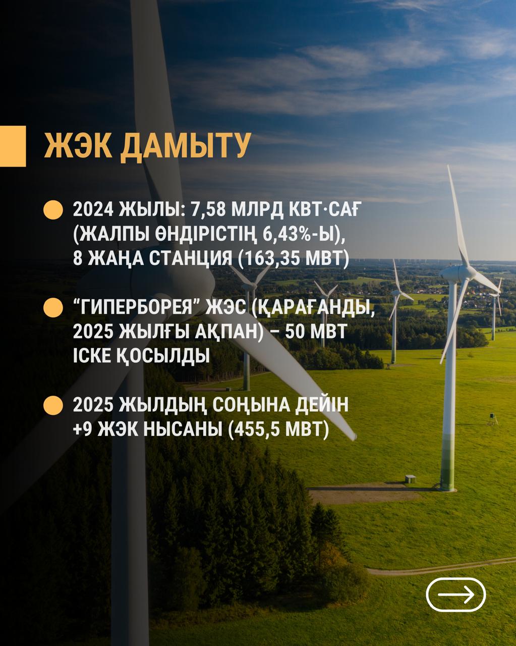 Жаңартылатын энергия көздерін дамыту басымдық болып қала береді: 2024 жылы 153 нысан 7,58 млрд кВт·сағ (жалпы өндірістің 6,43%-ы) өндірді. 8 жаңа станция (163,35 МВт) іске қосылды, ал 2025 жылдың соңына дейін тағы 9 ЖЭК жобасы іске қосылады (455,5 МВт). 2025 жылдың ақпан айында Қарағанды облысында қуаттылығы 50 МВт жел электр станциясы іске қосылды.