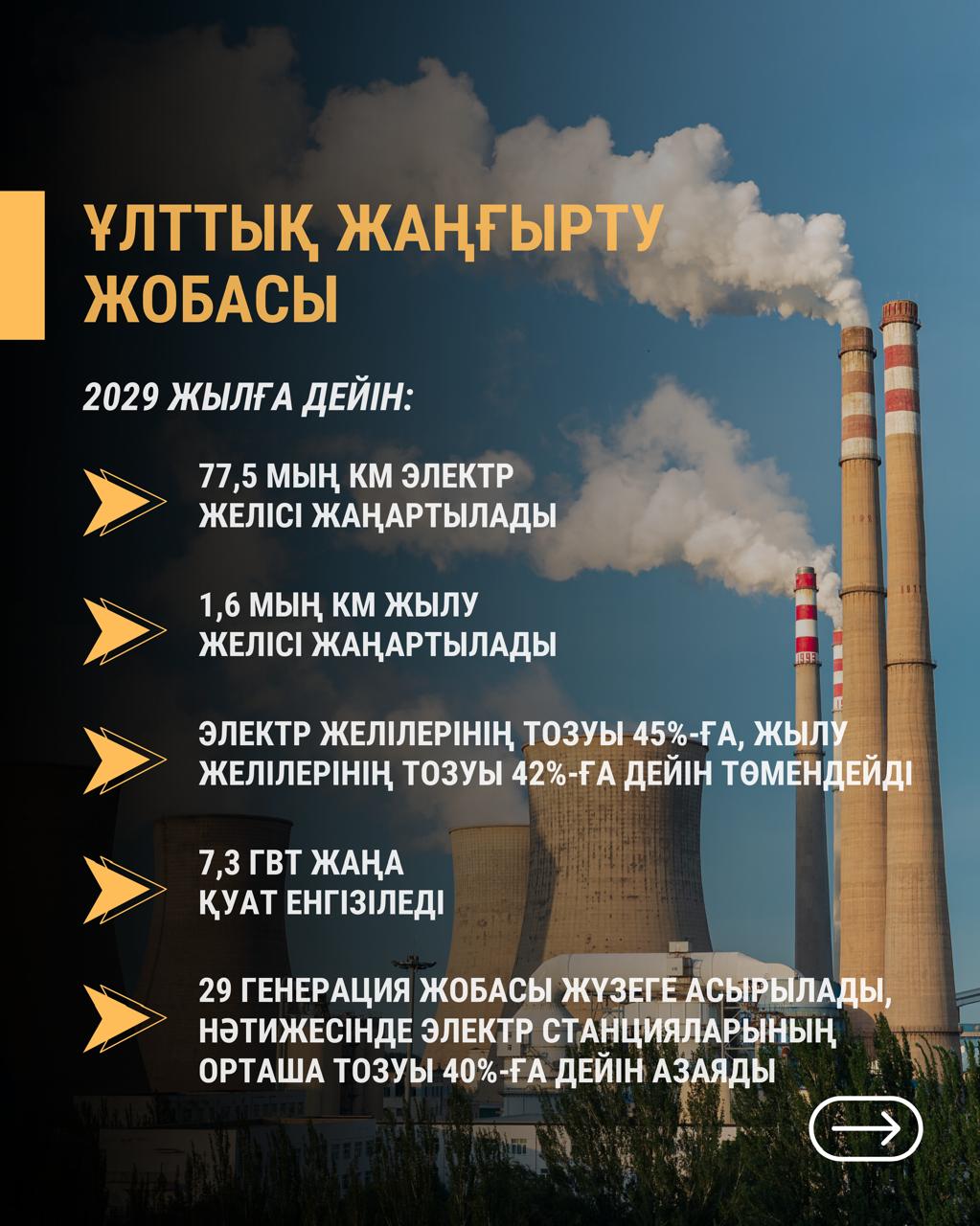 Ұлттық энергетикалық модернизация жобасы аясында 77,5 мың км электр желілері мен 1,6 мың км жылу желілері жаңартылатын болады, жалпы бюджеті 4 трлн теңге. 2029 жылға дейін бұл электр желілерінің тозуын 45%-ға, жылу желілерінің тозуын 42%-ға азайтуға мүмкіндік береді. Генерация саласында 7,3 ГВт жаңа қуат енгізу жоспарлануда, соның ішінде қолданыстағы станцияларды жаңарту және жаңа станциялар салу да бар. 2029 жылға дейін 29 жобаны аяқтап, электр станцияларының орташа тозуын 40%-ға дейін азайту жоспарланған.
