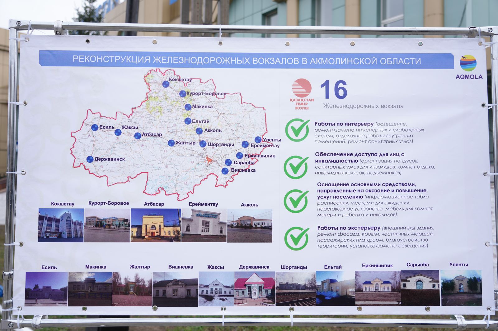 «Ірі қалалардағы вокзалдармен қатар, елді мекендер мен шалғай аудандарда орналасқан нысандарды да қамтыдық. Мәселен, Шығыс Қазақстан өңіріндегі барлық 5 вокзал, Ақмола облысында – 16, Атырау облысында – 9, Алматы облысында – 5, Ақтөбе облысында – 7, Абай облысында – 10, Жетісу облысында – 8, Батыс Қазақстан өңірінде – 4, Қарағанды облысында – 11 және басқа да өңірлердегі вокзалдар да жаңартылады», – деді көлік вице-министрі.