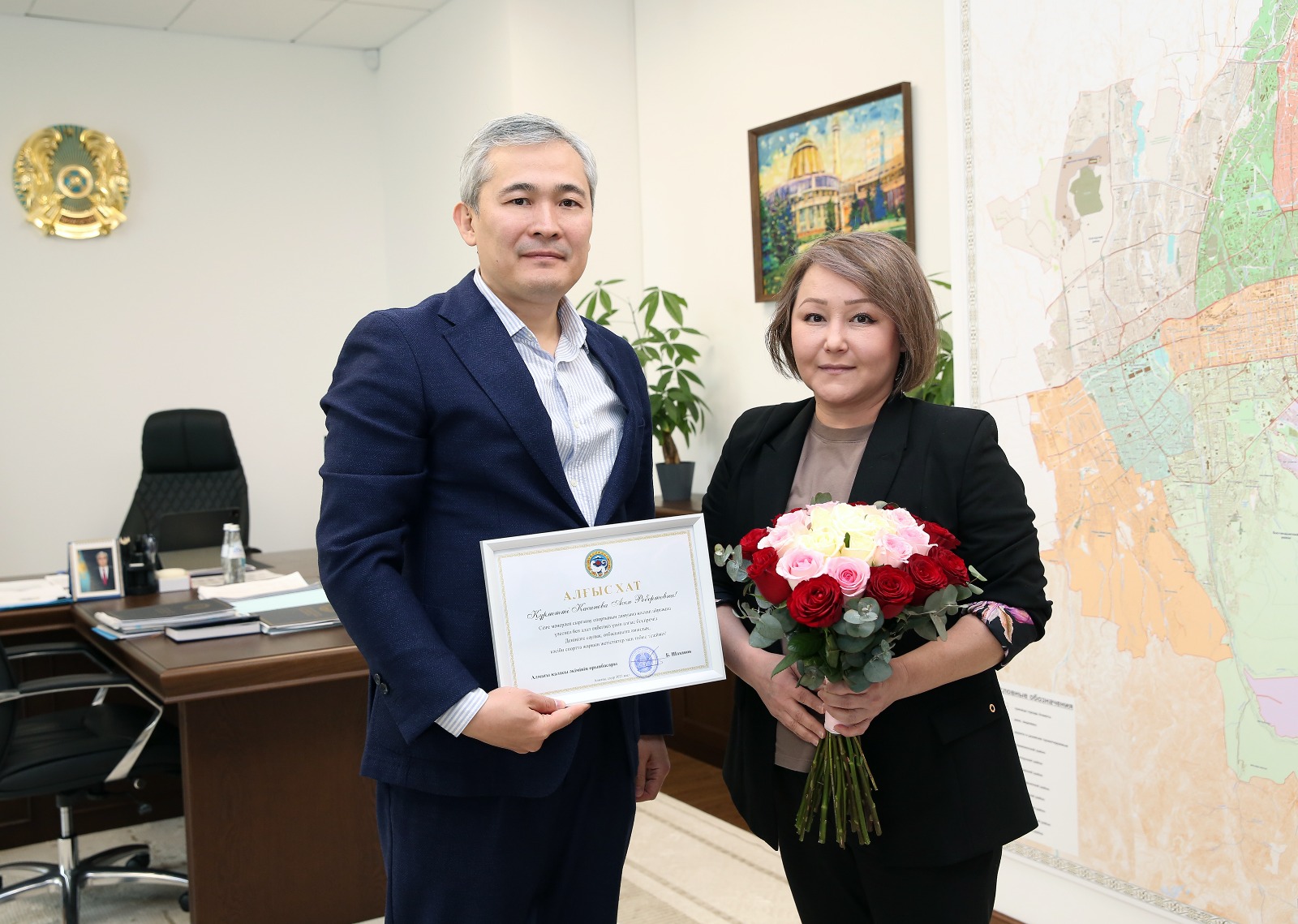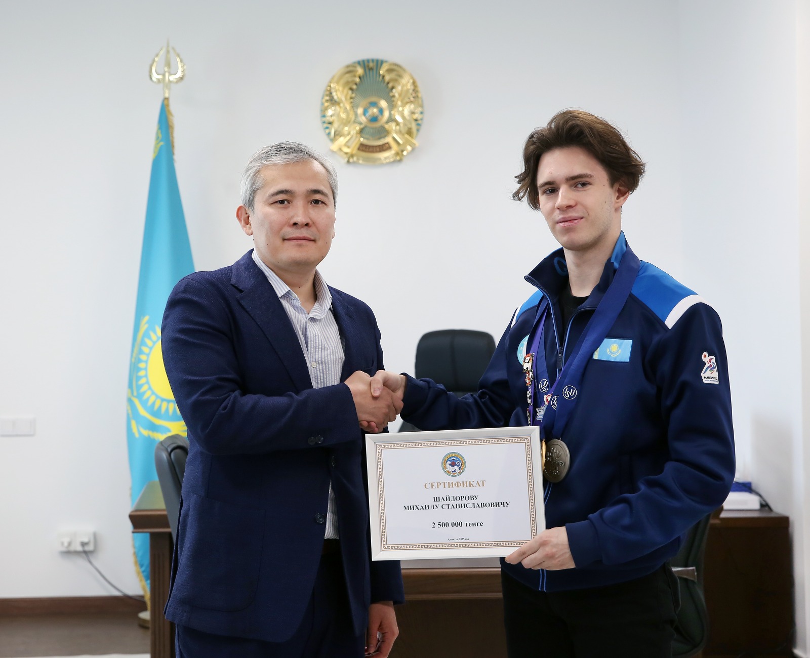 Қала әкімдігінде спортшыны Алматы әкімінің орынбасары Бейбіт Шаханов құттықтап, 2,5 миллион теңге көлемінде ақшалай сертификат табыс етті.
