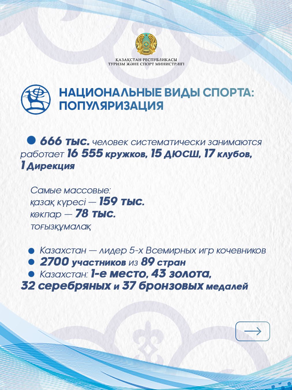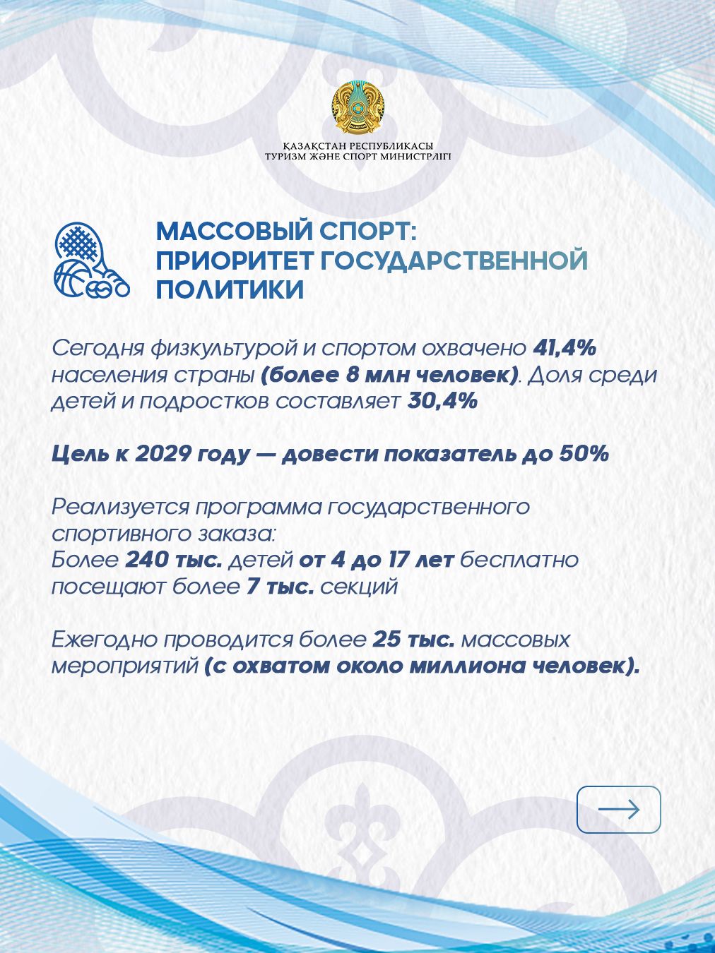 Бүгінгі таңда спортпен және дене шынықтырумен 8 миллионнан астам қазақстандық шұғылданады. Бұл ел халқының 41,4% құрайды. Мемлекет бұл көрсеткішті 2029 жылға қарай 50% – ға жеткізуді көздейді. Қазірдің өзінде тұрақты шұғылданушы балалар мен жасөспірімдердің үлесі 30% – дан асады. Мемлекеттік спорттық тапсырыс бағдарламасының ауқымы кеңеюде: 4 жастан 17 жасқа дейінгі 240 мыңнан астам бала 7 мыңнан астам спорт секцияларына тегін барады.