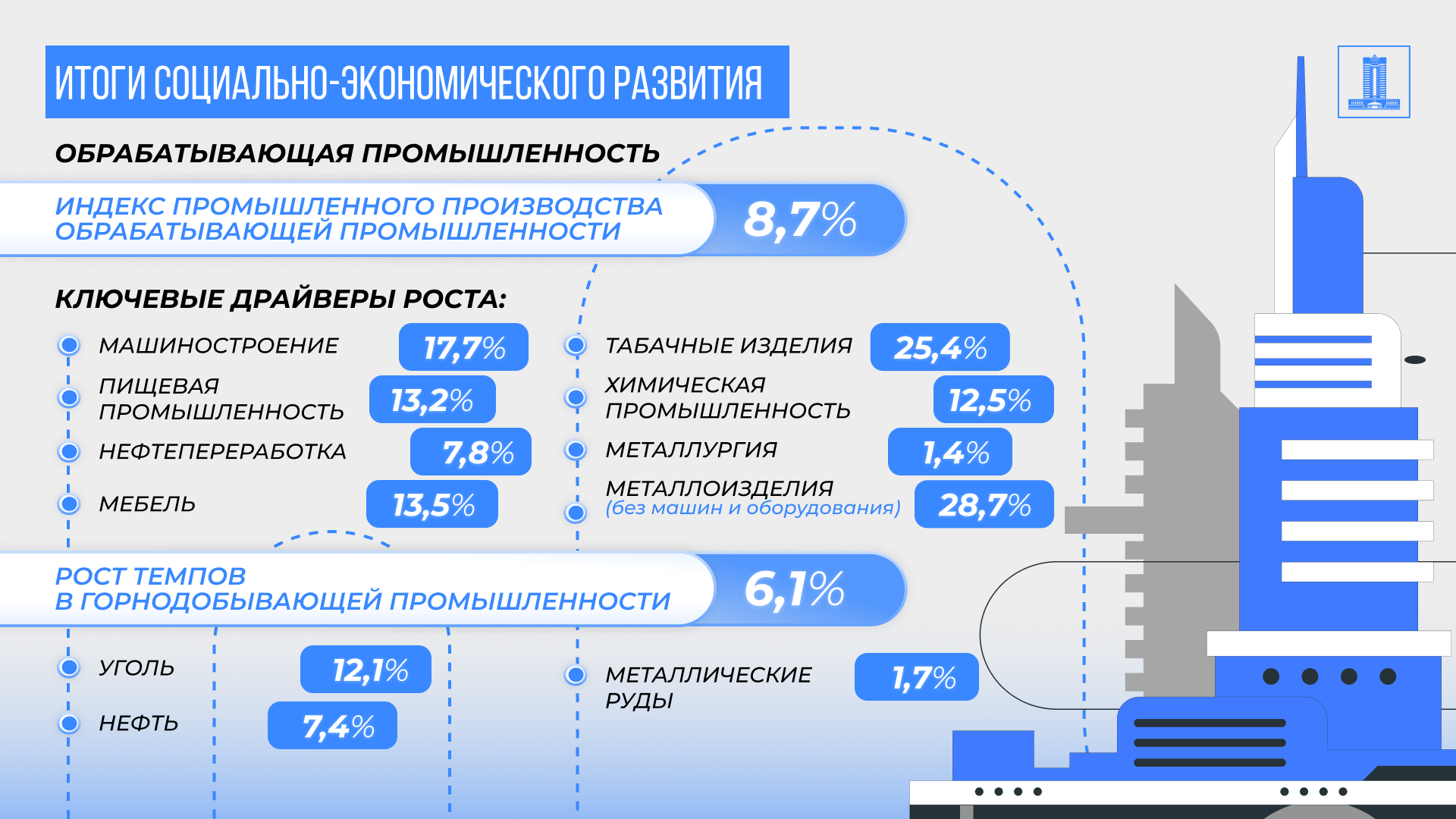 Биылғы қаңтар-наурыз айларында өңдеу өнеркәсібінде тұрақты оң серпін 8,7% деңгейінде сақталып отыр. Негізгі өсім машина жасау (17,7%), тамақ өндірісі (13,2%), машиналар мен жабдықтарды қоспағанда, дайын металл бұйымдары (28,7%) салаларындағы көрсеткіштердің өсуі арқасында қамтамасыз етілген. Сонымен қатар тау-кен өнеркәсібінде өсім (6,1%) байқалды.