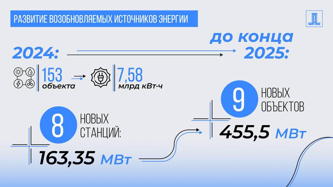 Жаңартылатын энергия көздерін дамыту да басым бағыт болып қала береді: 2024 жылы 153 нысан 7,58 млрд кВт·сағ немесе жалпы өндірістің 6,43%-ы өндірді. 8 жаңа станса (163,35 МВт) іске қосылды, ал 2025 жылдың соңына дейін тағы 9 ЖЭК жобасы (455,5 МВт) іске қосылады. Қазірдің өзінде биылғы жылдың ақпан айында Қарағанды облысында «Гиперборея» ЖШС-мен қуаты 50 МВт жел электр стансасы іске қосылды.