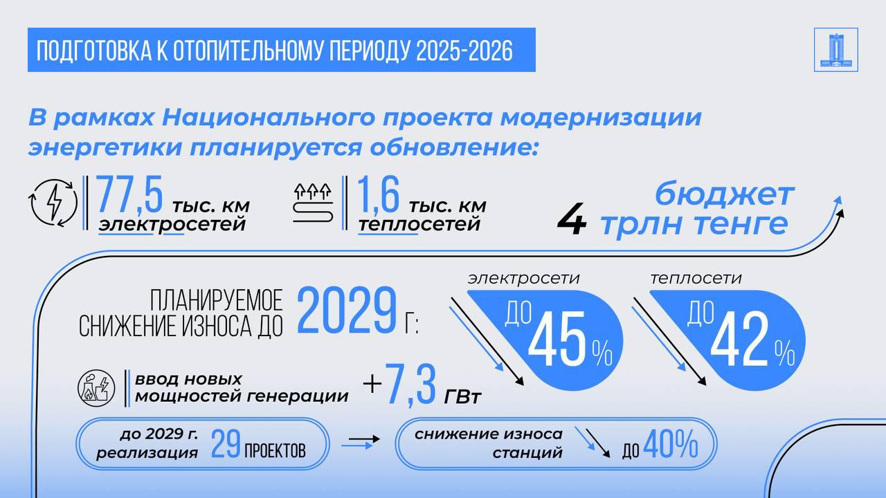 ✔️ Ұлттық энергетиканы жаңғырту ұлттық жобасы аясында жалпы бюджеті 4 трлн теңге болатын 77,5 мың шақырым электр желілері мен 1,6 мың шақырым жылу желілері жаңартылады. 2029 жылға дейін бұл электр желілерінің тозуын 45%-ға, жылу желілерінің тозуын 42%-ға төмендетуге мүмкіндік береді. Генерация саласында 7,3 ГВт жаңа қуат енгізу, оның ішінде қолданыстағы стансаларды жаңарту және жаңа стансалар салу жоспарлануда. 2029 жылға дейін 29 жобаны аяқтау жоспарланған, бұл электр стансаларының орташа тозуын 40%-ға дейін төмендетуге мүмкіндік береді.