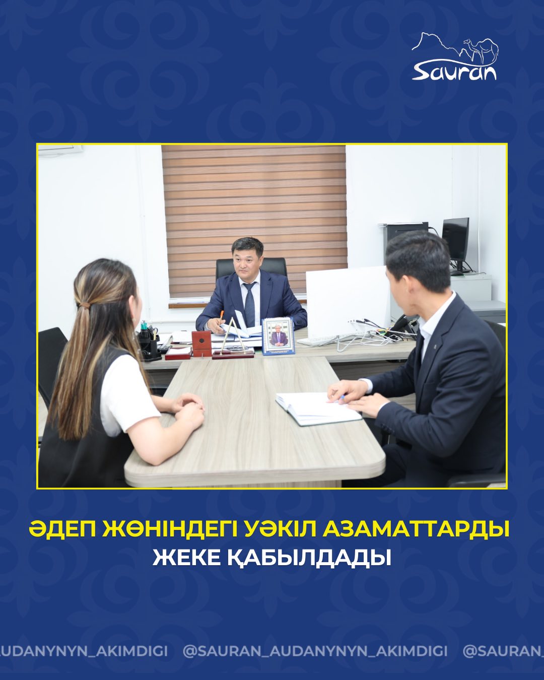 Сауран ауданы әкімінің аппарат басшысы, сондай-ақ аудан әкімдігінің әдеп жөніндегі уәкілі Бекзат Абубакиров аудан тұрғындарын жеке мәселелері бойынша қабылдау өткізді. Қабылдау барысында азаматтар тарапынан негізінен тұрақты жұмысқа орналасу, мемлекеттік қызметке тұру мүмкіндіктері және осы бағыттағы талаптар туралы сұрақтар көтерілді.