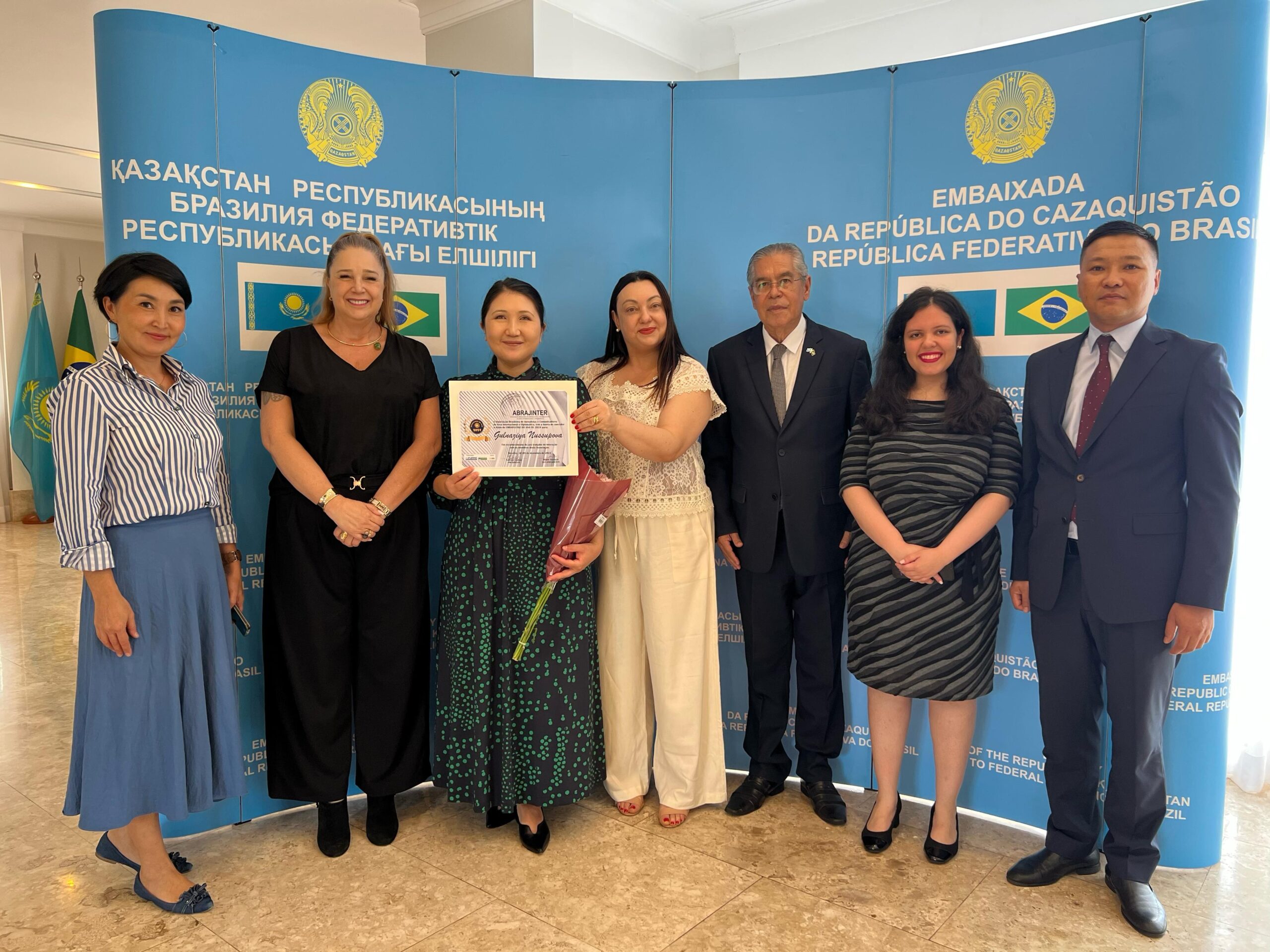 Бразилиа, 2025 жылғы 14 сәуір – Қазақстанның Бразилиядағы Елшілігінде Бразилияда аккредиттелген дипломатиялық миссиялар басшыларының жұбайы (GCCM) қауымдастығының президенті, Қазақстанның Бразилиядағы Eлшісінің жұбайы Нүсіпова Гүлнәзия ханымға Бразилияның журналистер ассоциясы «Жыл Елшісінің жұбайы» санатындағы құрмет грамотасын тапсыру рәсімін өткізді.