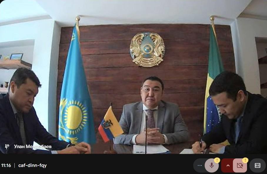 Бразилиa, 2025 жылғы 15 сәуір – Қазақстанның Бразилиядағы Елшісі Болат Нүсіповтың еліміздің Кито қаласындағы Құрметті консулы, Эквадордың құрылыс индустриясы палатасының президенті және Іскерлік комитетінің басшысы Леопольдо Фернандо Окампо Андраде мырзамен онлайн-кездесуі өтті.