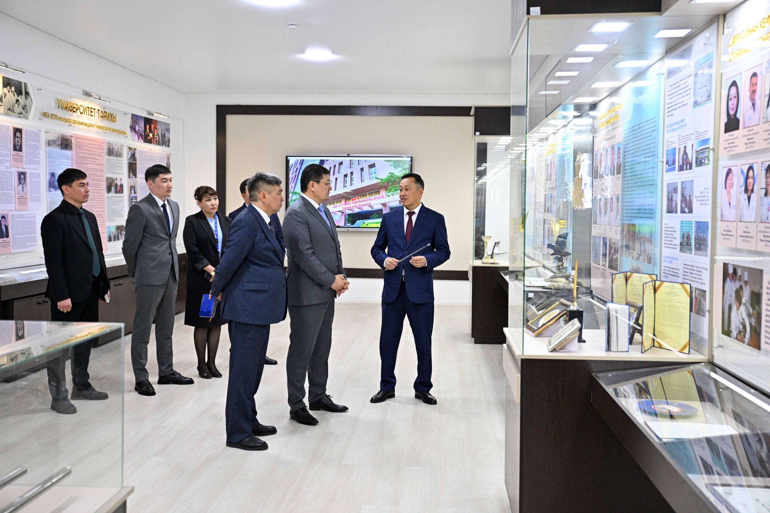 Облыс әкімі университеттің бас корпусындағы музейді, кітапхананы, виртуальды бейнестудия залдарын аралап, ардагер ұстаздармен, оқытушылармен, студенттермен кездесті. Оқу орнының ректоры аймақ басшысына «Цифрлық университет» жобасын таныстырды.