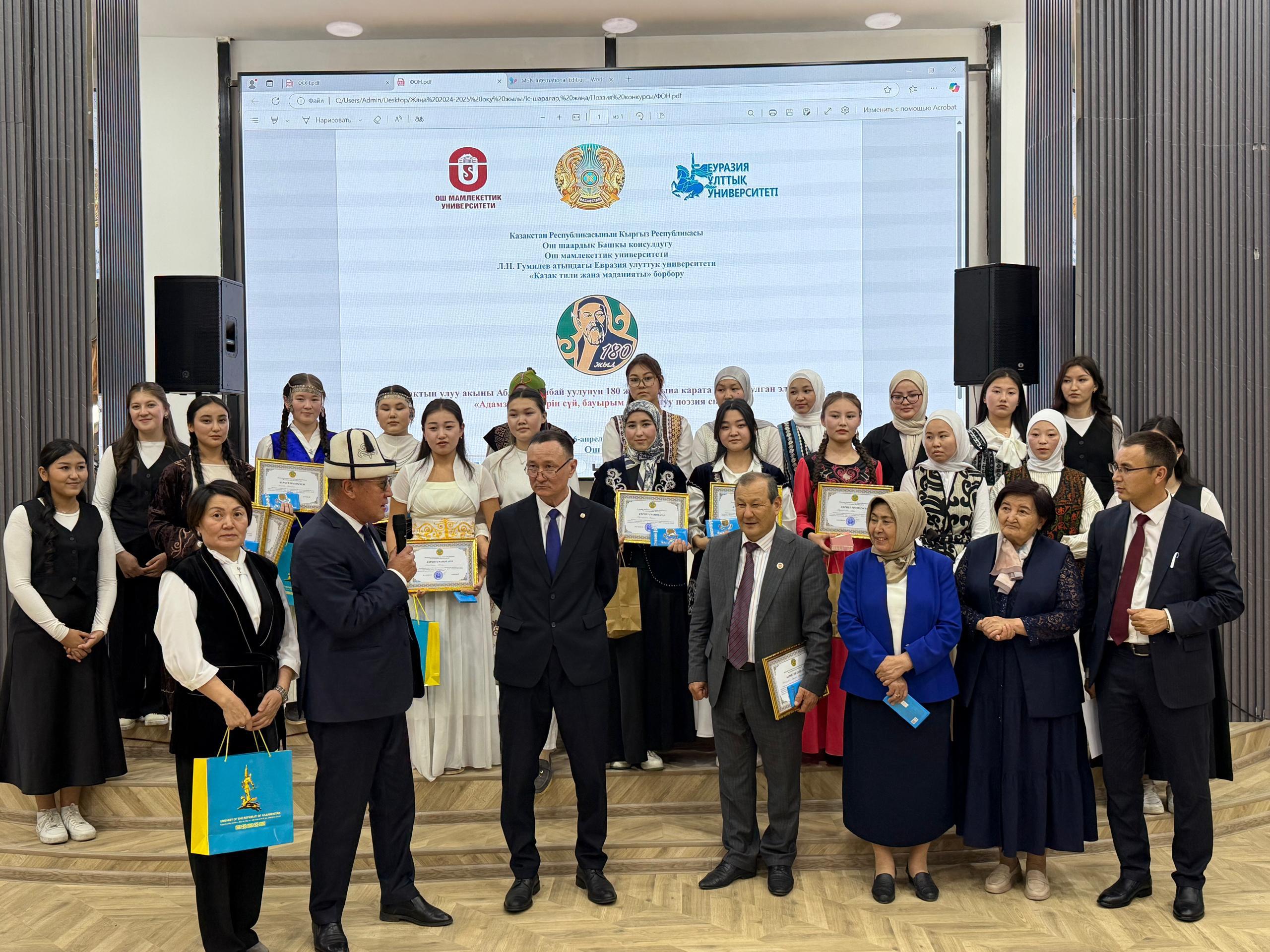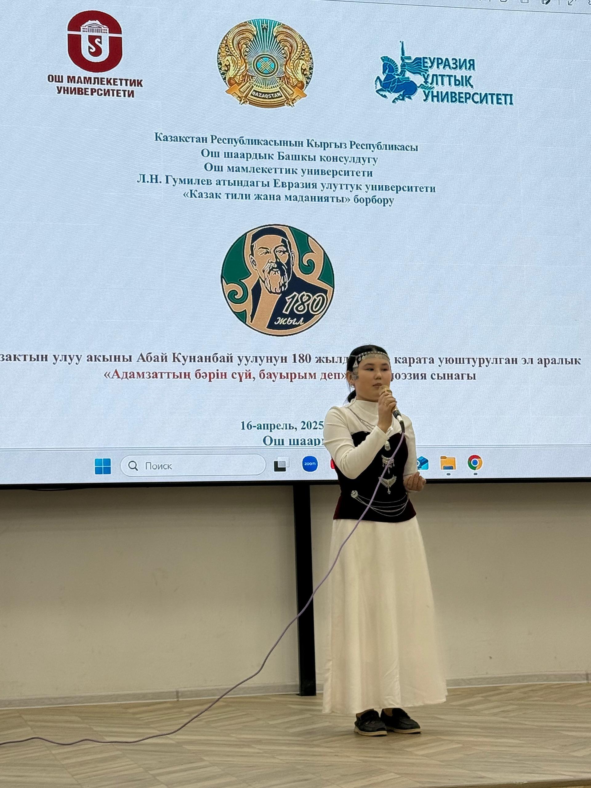 Қазақстан Республикасының Ош қаласындағы Бас консулдығының және Ош мемлекеттік университетіндегі «Қазақ тілі мен мәдениетіорталығының» ұйымдастыруымен 2025 жылғы 16 сәуірде Ош қаласында қазақтың ұлы ақыны Абай Құнанбайұлының 180 жылдық мерейтойы аясында «Адамзаттың бәрін сүй, бауырым деп» атты халықаралық поэзия конкурсыөткізілді.