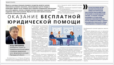 2025 жылғы 04 сәуірдегі Заң газетінде Павлодар облысы Әділет департаментінің Құқықтық түсіндіру және заңгерлік қызмет көрсету бөлімінің басшысы А. Сергазиновтың «Тегін заң көмегін көрсету» тақырыбында мақаласы жарияланды.
