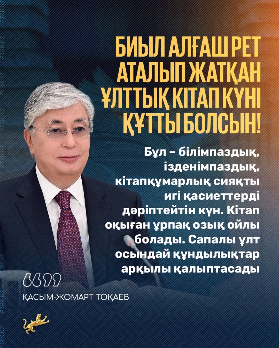 Соған сәйкес, биылдан бастап 23 сәуір – Ұлттық кітап күні болып белгіленді. Атаулы күнге орай Президент Қасым-Жомарт Тоқаев қазақстандықтарды құттықтады.