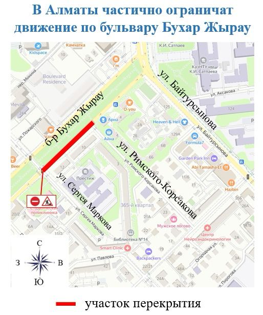 Жоспарлы жұмыстарды жүргізу қауіпсіздігін қамтамасыз ету үшін 2025 жылғы 23 сәуір мен 10 маусым аралығында Бұқар Жырау бульвары бойынша Сергей Марков көшесінен Римский-Корсаков көшесіне дейін оңтүстік жағынан автокөлік қозғалысы ішінара жабылады.