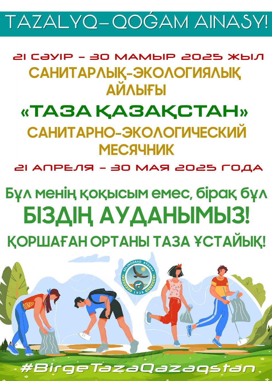 📣2025 жылғы 21 сәуір мен 30 мамыр аралығында Целиноград ауданының елді мекендерін санитарлық тазалау, абаттандыру және көгалдандыру көктемгі айлығы өткізіледі.