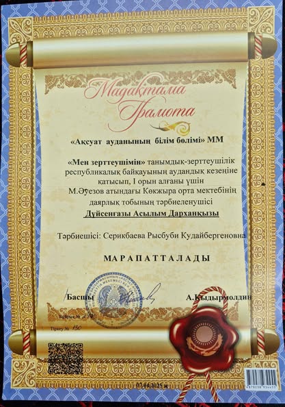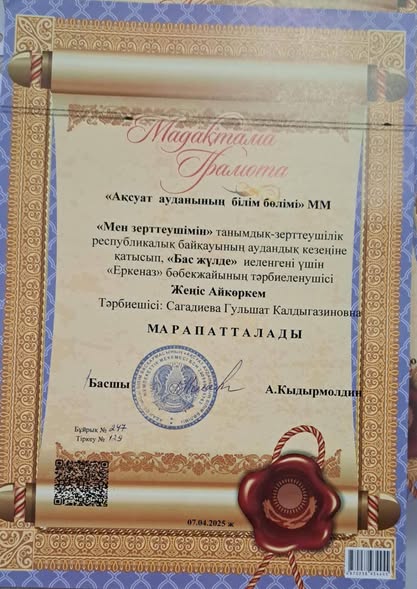 Облыстық білім басқармасынан келген ережеге сай, «Мен зерттеушімін» танымдық-зерттеушілік республикалық байқауының аудандық кезеңі 2025 жылдың 7 сәуір күні Ақсуат ауданының білім бөлімінің конференция залында өтті. 13 мекемеден тәрбиеленушілер аудандық кезеңге қатысып, нәтижесінде “Бас жүлде” иеленген “Еркеназ” бөбекжайының тәрбиеленушісі Жеңіс Айкөркем, І орын иеленген М.Әуезов атындағы Көкжыра орта мектебінің даярлық тобының тәрбиеленушісі Дүйсенғазы Асылым, І орын иеленген “Асыл” бөбекжайының тәрбиеленушілері Толеухан Мансұр, Нұрланғазы Бексұлтан, Кәдірбек Медина, Көшкінбай Аяжан иеленіп, облыстық кезеңге жұмыстары ұсынылды. Қалған қатысушыларымыз білім бөлімінің мақтау қағаздарымен, номинацияларымен марапатталды.