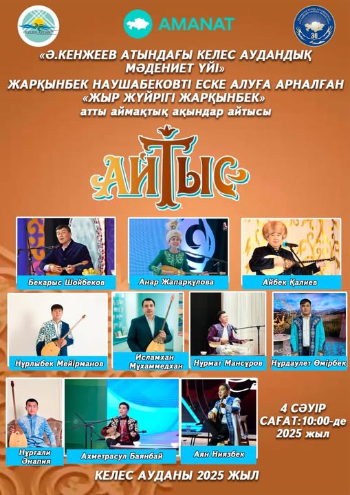 Сіздерді Ә.Кенжеев атындағы Келес аудандық мәдениет үйінде Жарқынбек Наушабековті еске алуға арналған «Жыр жүйрігі Жарқынбек» атты жаңғырып келген айтыс аламанына шақырамыз. Айтыс 4 сәуір сағат 10:00 де.