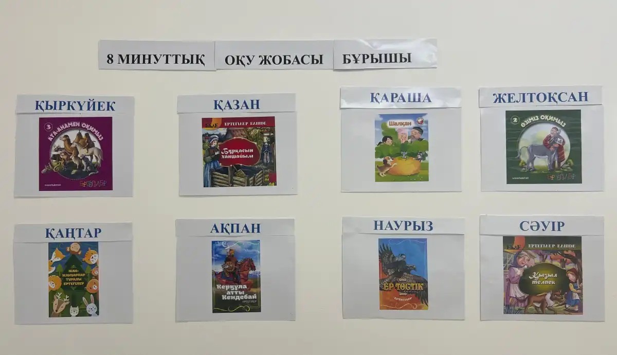 «Оқушылар күнделікті 07.45-те мектепке келеді, ал 07.50-де 8 минуттық оқу басталады. Бастауыш сыныптағылардың оқуына арналған ертегілер әр сыныптың бұрышында орналасқан. Ал жоғары сыныптың оқушылары өздерінің күнделікті оқып жүрген әдебиеттерін алып келіп оқиды. Ай аяқталған кезде қорытынды бойынша ертегілерден қойылым қояды, суреттер салады, ал жоғары сынып оқушылары өздері оқыған кітаптар бойынша жоба жұмысын жасап, қорғайды. Оның барлығы сынып жетекшілерінің ұйымдастыруымен жүргізіледі. Кейде балалардың оқып жатқан кітаптарына қарап, танымал жазушылар мектепке шақырылып, кездесу өткізіледі», – деді аталған жоба туралы №8 мектеп-лицейдің директоры Гүлнұр Айтымова.