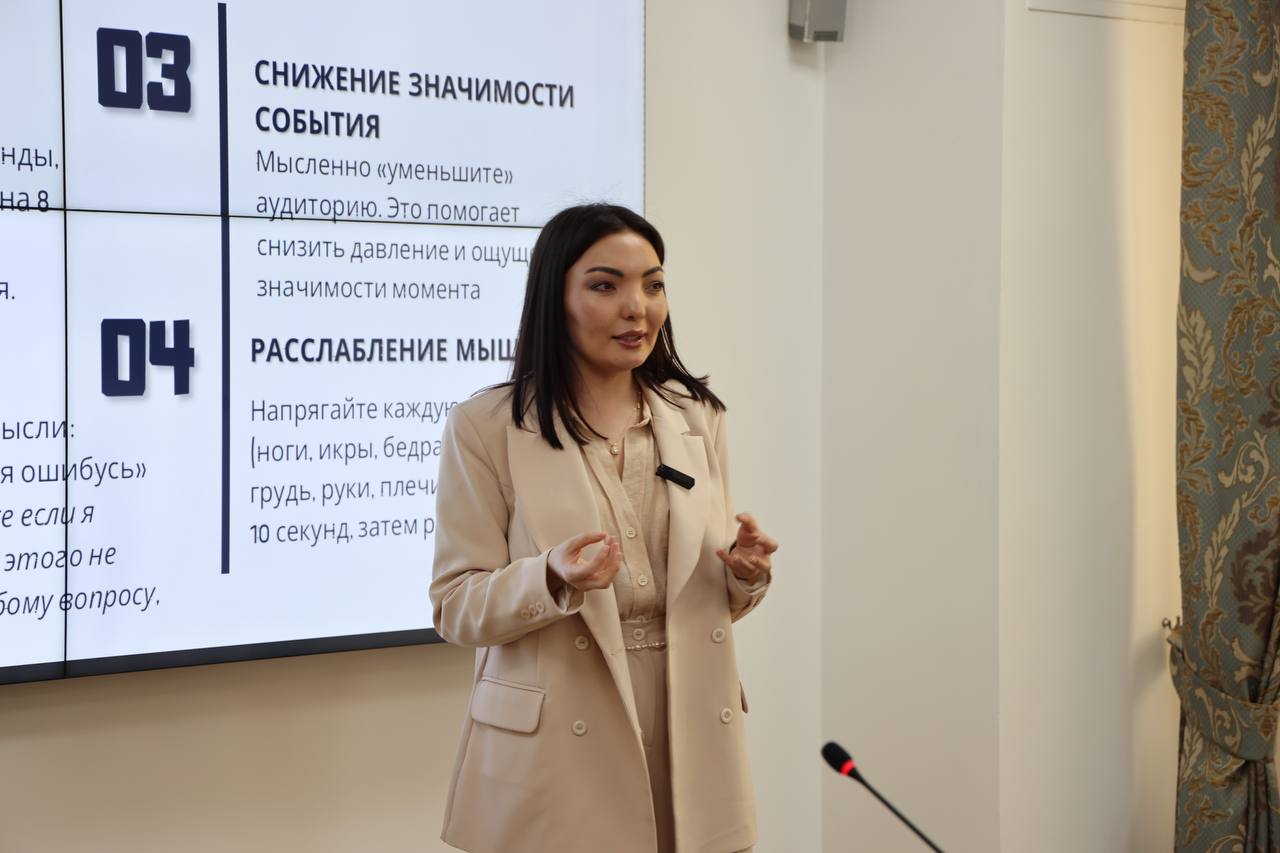 Тренинг барысында қатысушылар көпшілік алдында сөйлеу және аудиториямен жұмыс істеу дағдыларын пысықтады: сөйлеуді құрылымдауды, тыңдаушылардың назарын аударуды, әңгімелесу динамикасын басқаруды және күрделі сұрақтарға жауап беруді, сондай-ақ презентация форматын әртүрлі мақсатты топтарға бейімдеуді үйренді.