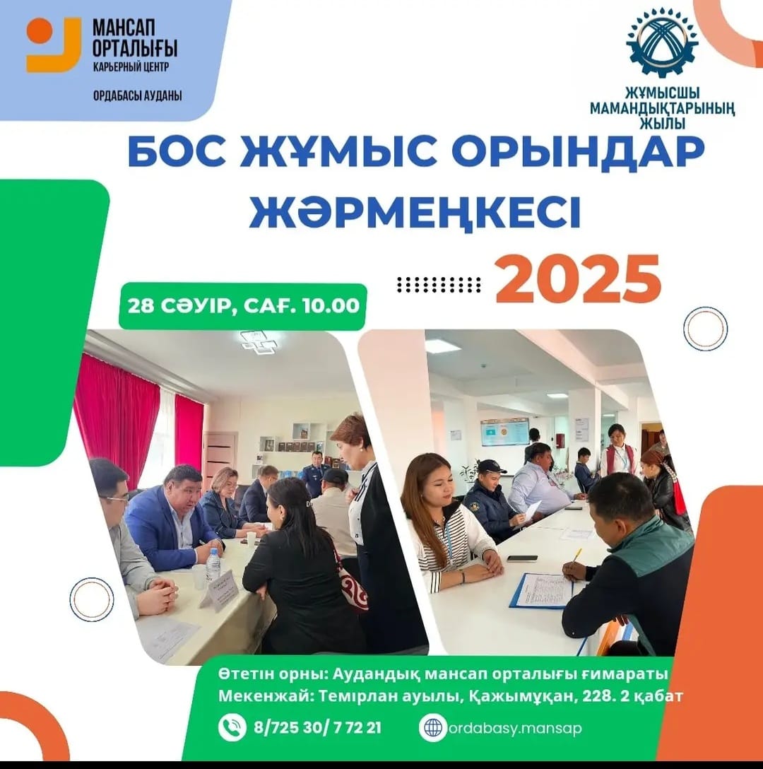 Әлемдік қауымдастықтың жыл сайын атап өтетін 28 сәуір – Дүниежүзілік еңбекті қорғау күніне орай, Ордабасы аудандық “Мансап орталығы”филиалының ғимаратында бос жұмыс орындары жәрмеңкесі өтеді.