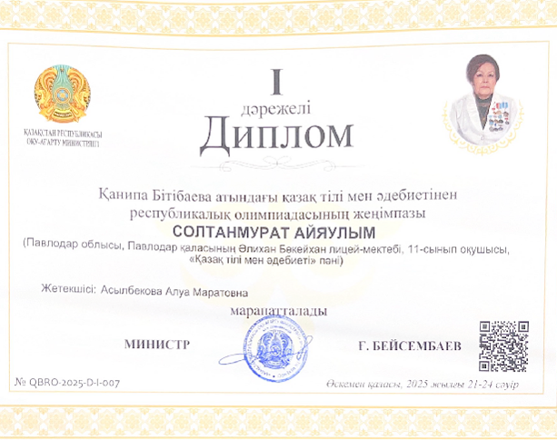 Олимпиада қорытындысы бойынша павлодарлық оқушы өз білімін растап, облыс қоржынына алтын медаль енгізіп, Қазақстан Республикасы Білім министрлігінің І дәрежелі дипломымен марапатталды.