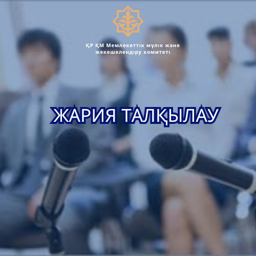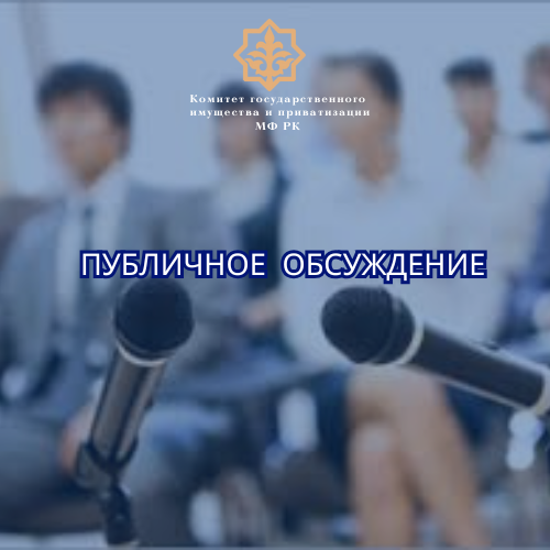 2025 жылдың 29 сәуірінде сағат 15.00-де Астана қаласы, Бейбітшілік көшесі, 57 (1-қабат, 102-кабинет) мекенжайы бойынша, сондай-ақ инстаграм желісі арқылы Қазақстан Республикасы Қаржы министрлігі Мемлекеттік мүлік және жекешелендіру комитетінің Астана қаласы мемлекеттік мүлік және жекешелендіру департаменті Қазақстан Республикасы Қаржы министрлігі Мемлекеттік мүлік және жекешелендіру комитеті төрағасының 2024 жылғы 11 сәуірдегі №Л-69 бұйрығына сәйкес Департамент қызметінің сыбайлас жемқорлық тәуекелдеріне ішкі талдаудың жария талқылауын өткізуді жоспарлауда.