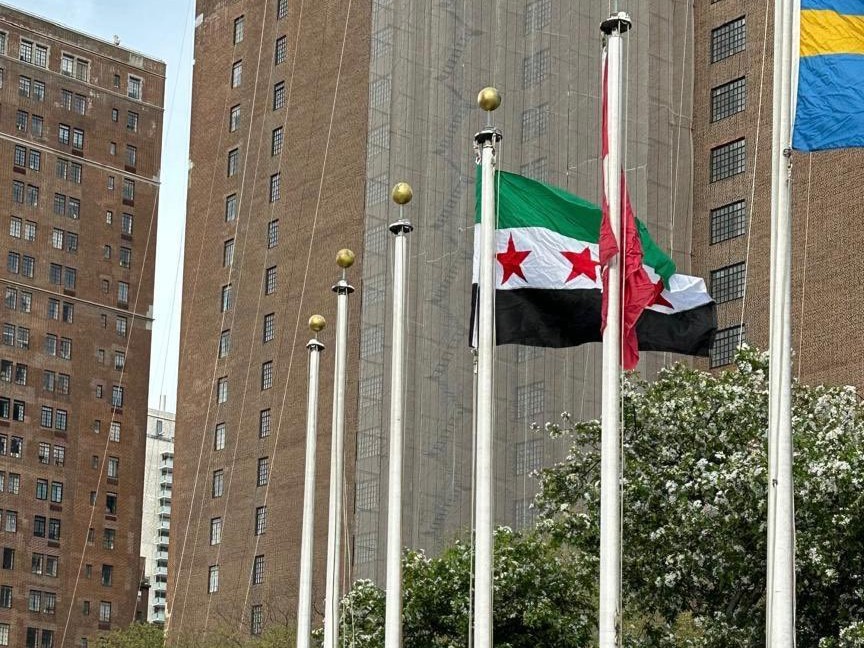 Нью-Йорк, 2025 жылғы 25 сәуір – Нью-Йорктегі Біріккен Ұлттар Ұйымының штаб-пәтерінде Сирияның жаңа туын көтеру рәсімі өтті.