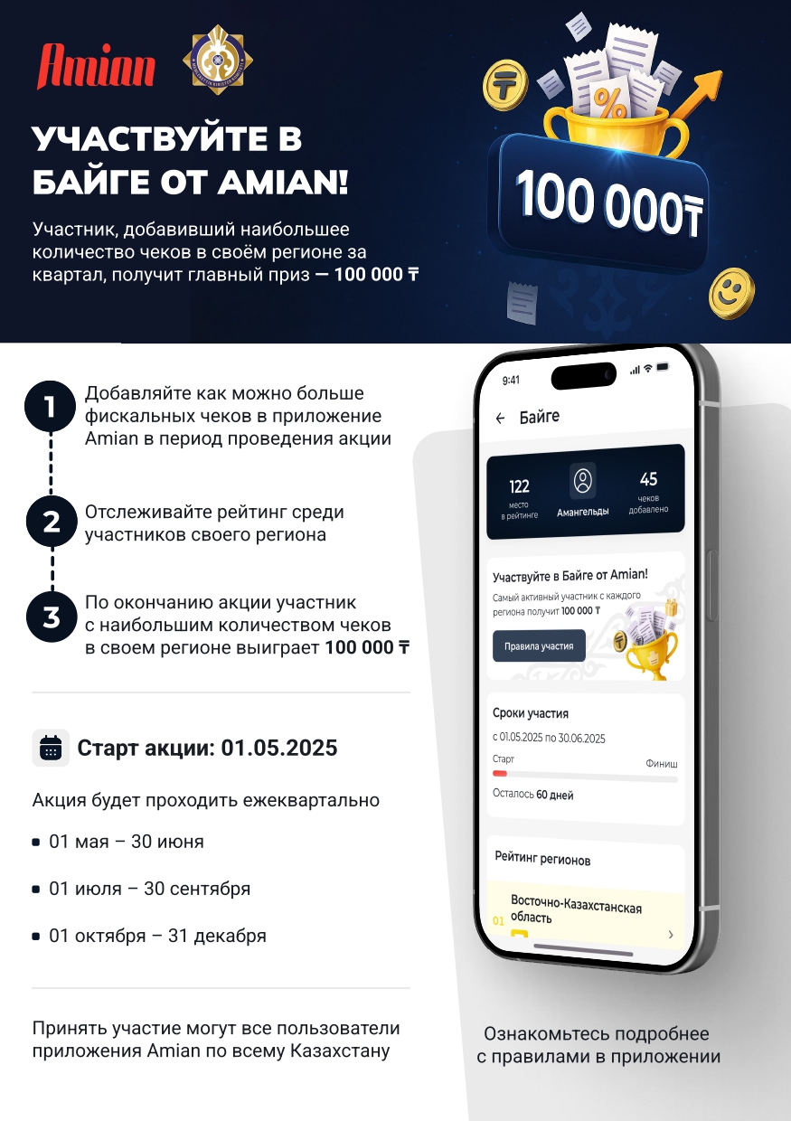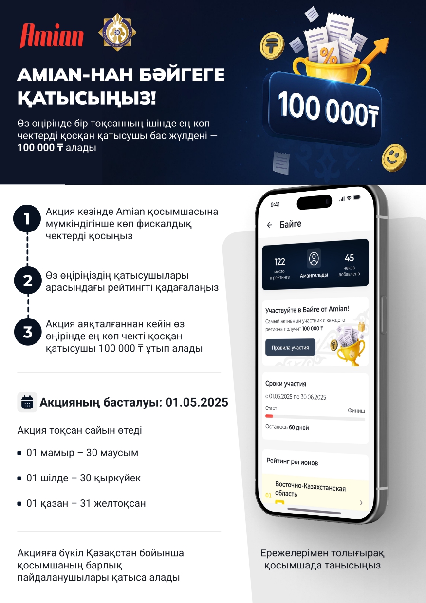 Акцияға қатысу үшін тауарлар, жұмыстар және қызметтер үшін төлем чектерін «Amian» мобильді қосымшасында тіркеу қажет.