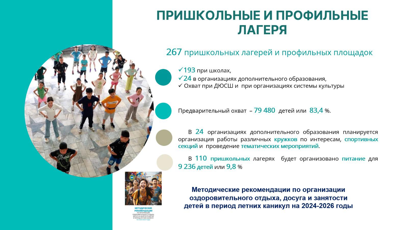 Биыл жазғы маусымда 94 мыңнан астам оқушы түрлі іс-шаралармен қамтылмақ. Оның ішінде 15 мыңнан астам бала әлеуметтік осал санатқа жатады. Олар үшін тегін жолдамалар қарастырылған.