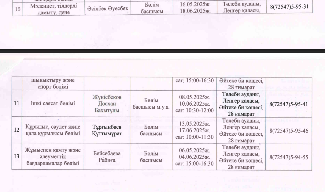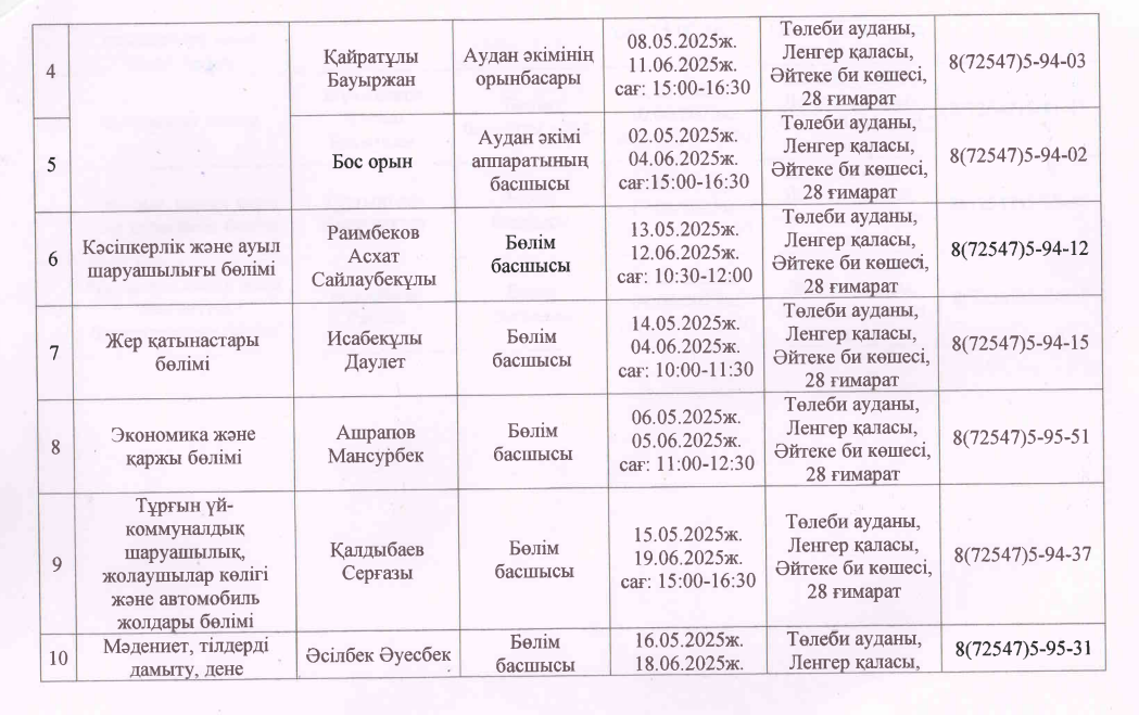 Төлеби ауданы әкімдігі басшыларының Азаматтарды қабылдау орталығында азаматтарды қабылдаудың 2025 жылғы 2-тоқсанға арналған кестесі